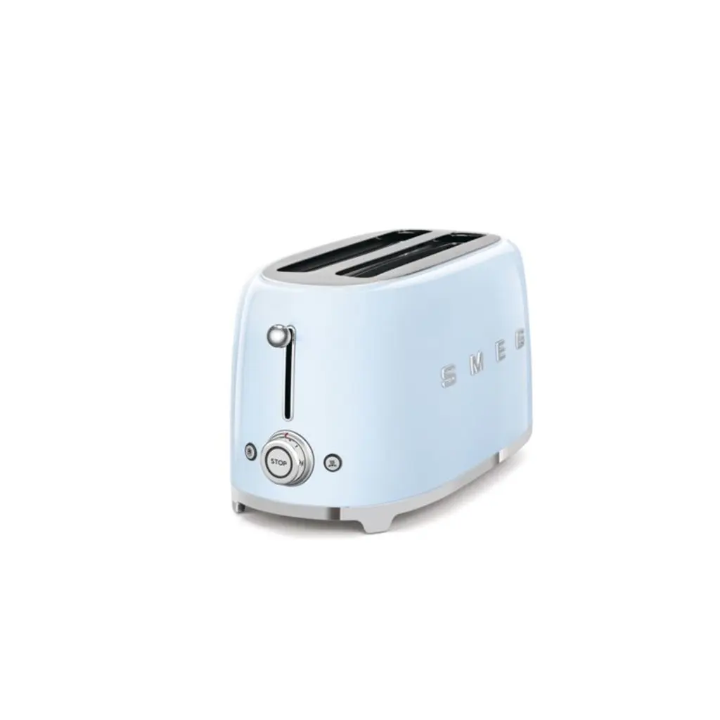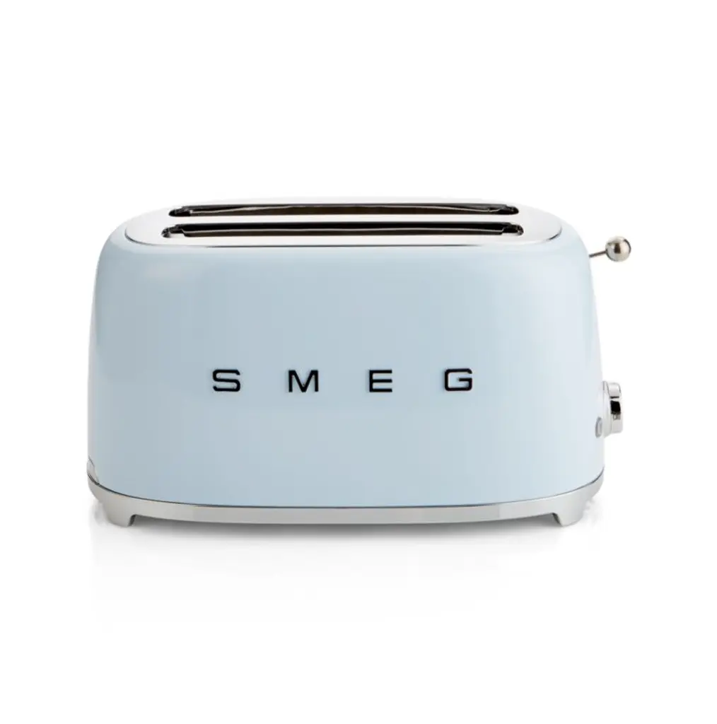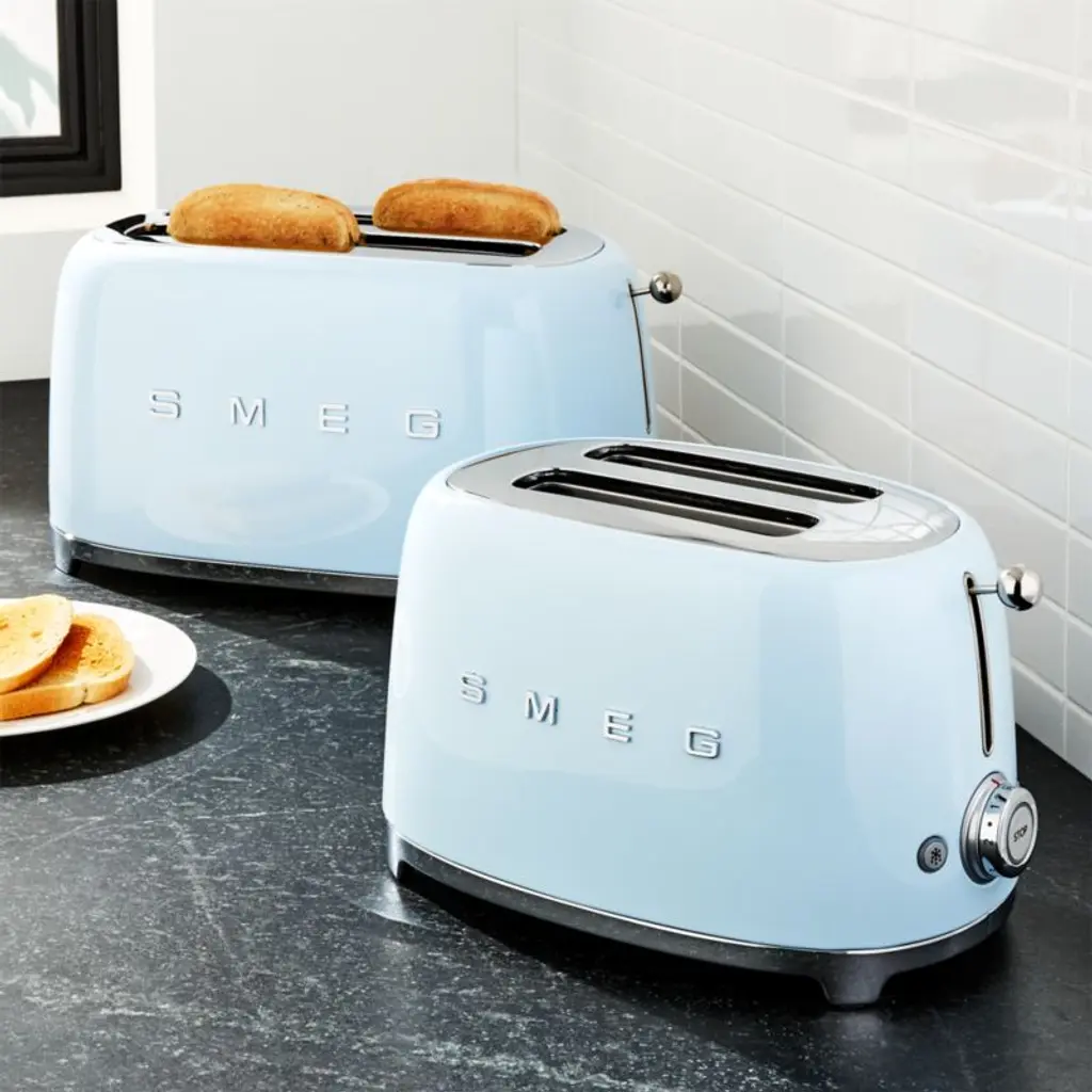 Known for its wonderfully retro refrigerators, Smeg has launched a joyfully designed retro kitchen appliance collection based on the curved and compact lines of postwar design. Incorporating a 1950s-era aesthetic, Smeg's nod to the past is the star of today's kitchen, incorporating all the current advances in technology. Enameled in pastel blue and accented with a charming ball lever knob, this retro toaster browns bread at six levels with three convenient pre-set programs. Extra-wide slots accommodate different slice widths and self-centering racks ensure even toasting.View all SMEG products