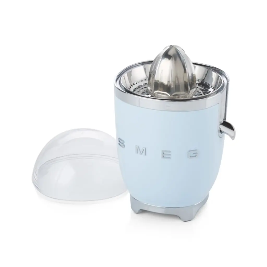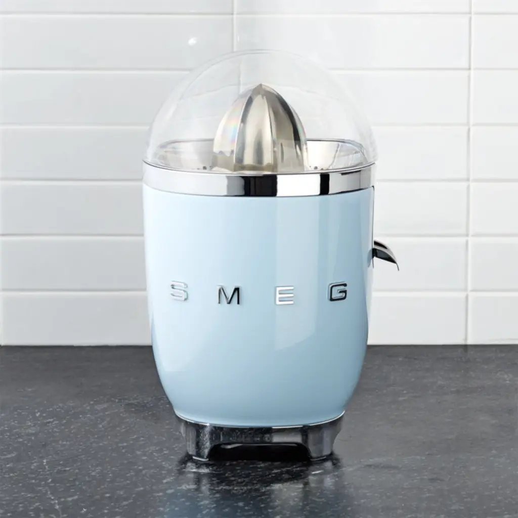 With its charming bullet shape and fun chrome metal accents, this glossy white juicer effortlessly transforms oranges, grapefruit, limes and lemons into tasty juice for sipping, cocktails or salad dressings. The anti-drip spout pours neatly, and the built-in cord wrap allows for neat storage.Known for its wonderfully retro refrigerators, SMEG has created a joyfully designed kitchen appliance collection based on the compact, curved lines of postwar design. SMEG's nod to the past is the star of today's kitchen, incorporating all the current advances in technology while celebrating vintage aesthetics.