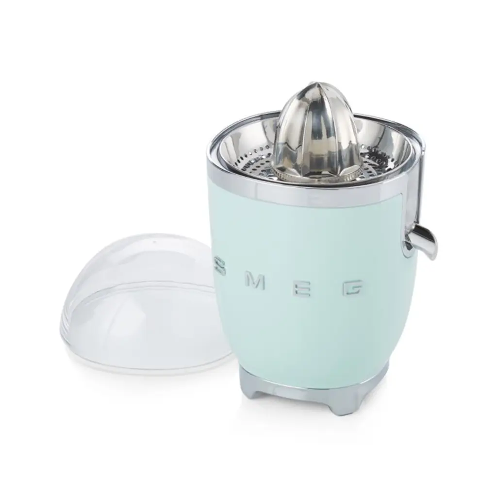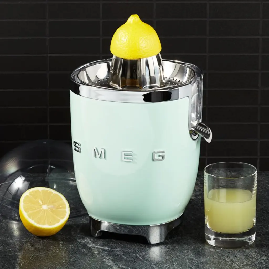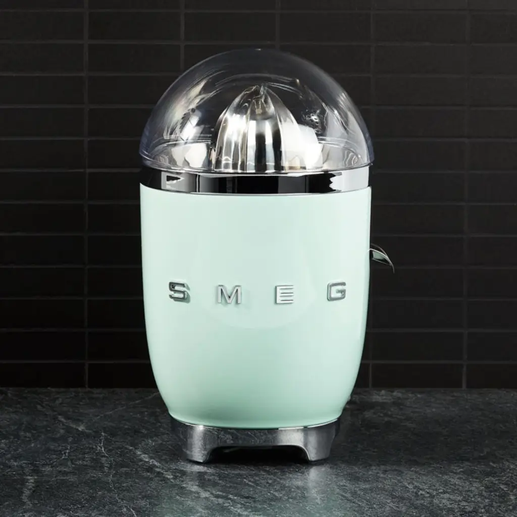 With its charming bullet shape and fun chrome metal accents, this glossy white juicer effortlessly transforms oranges, grapefruit, limes and lemons into tasty juice for sipping, cocktails or salad dressings. The anti-drip spout pours neatly, and the built-in cord wrap allows for neat storage.Known for its wonderfully retro refrigerators, SMEG has created a joyfully designed kitchen appliance collection based on the compact, curved lines of postwar design. SMEG's nod to the past is the star of today's kitchen, incorporating all the current advances in technology while celebrating vintage aesthetics.