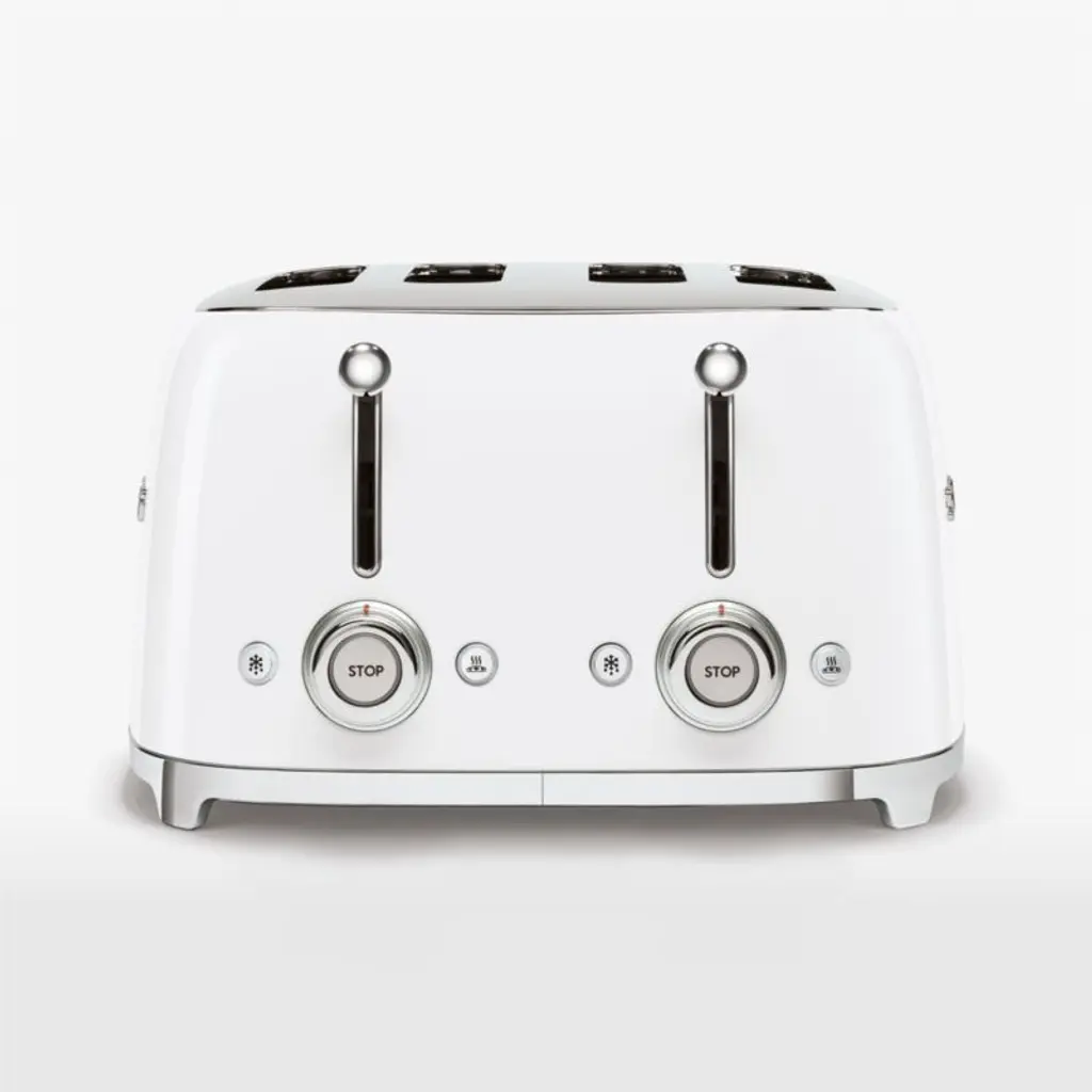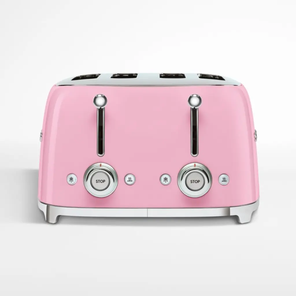 Finished in bubblegum pink and accented with a charming chrome ball-lever knob, this retro four-slice toaster browns bread at six levels with three convenient pre-set programs. The four extra-wide slots accommodate different slice widths, and self-centering racks ensure even toasting. Known for its wonderfully retro refrigerators, Smeg has launched a joyfully designed kitchen appliance collection based on the curved and compact lines of postwar design. Smeg's nod to the past is the star of today's kitchen, incorporating all the current advances in technology.View allSmeg appliances