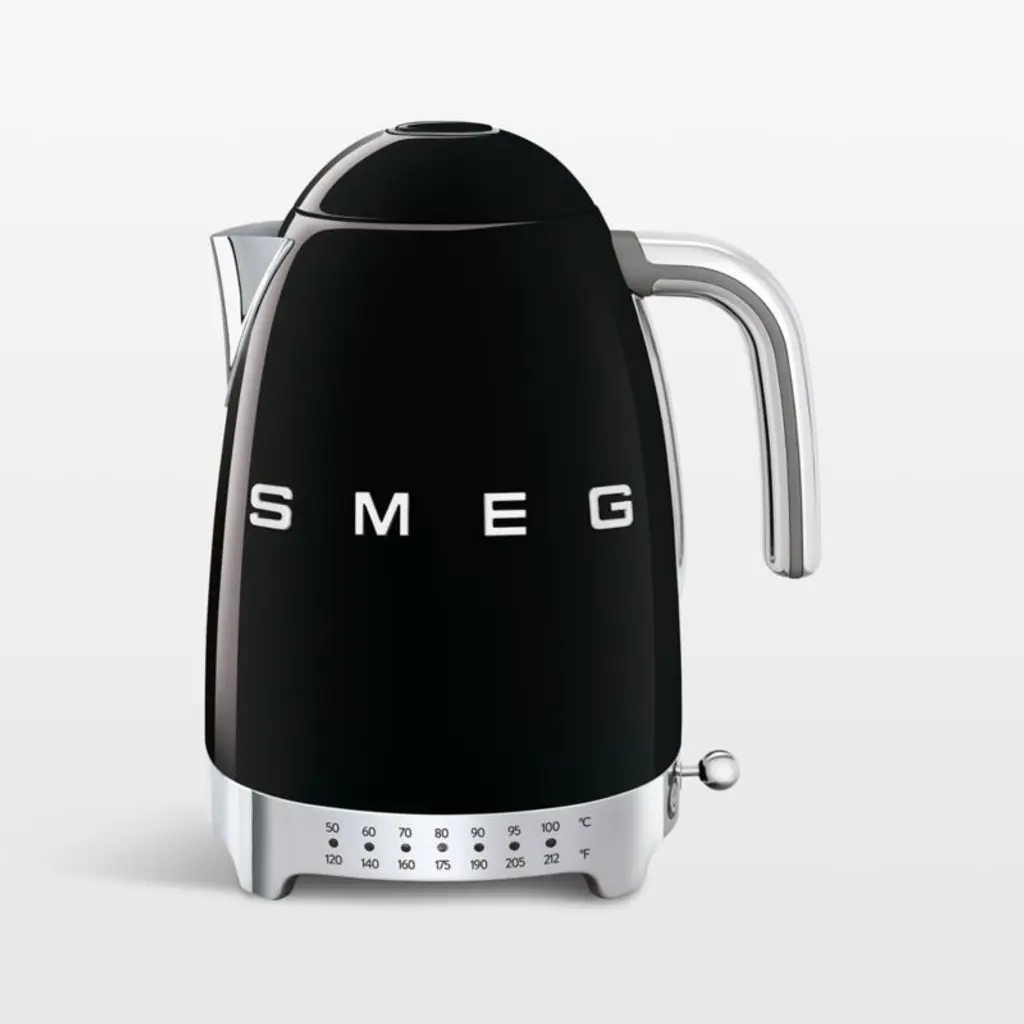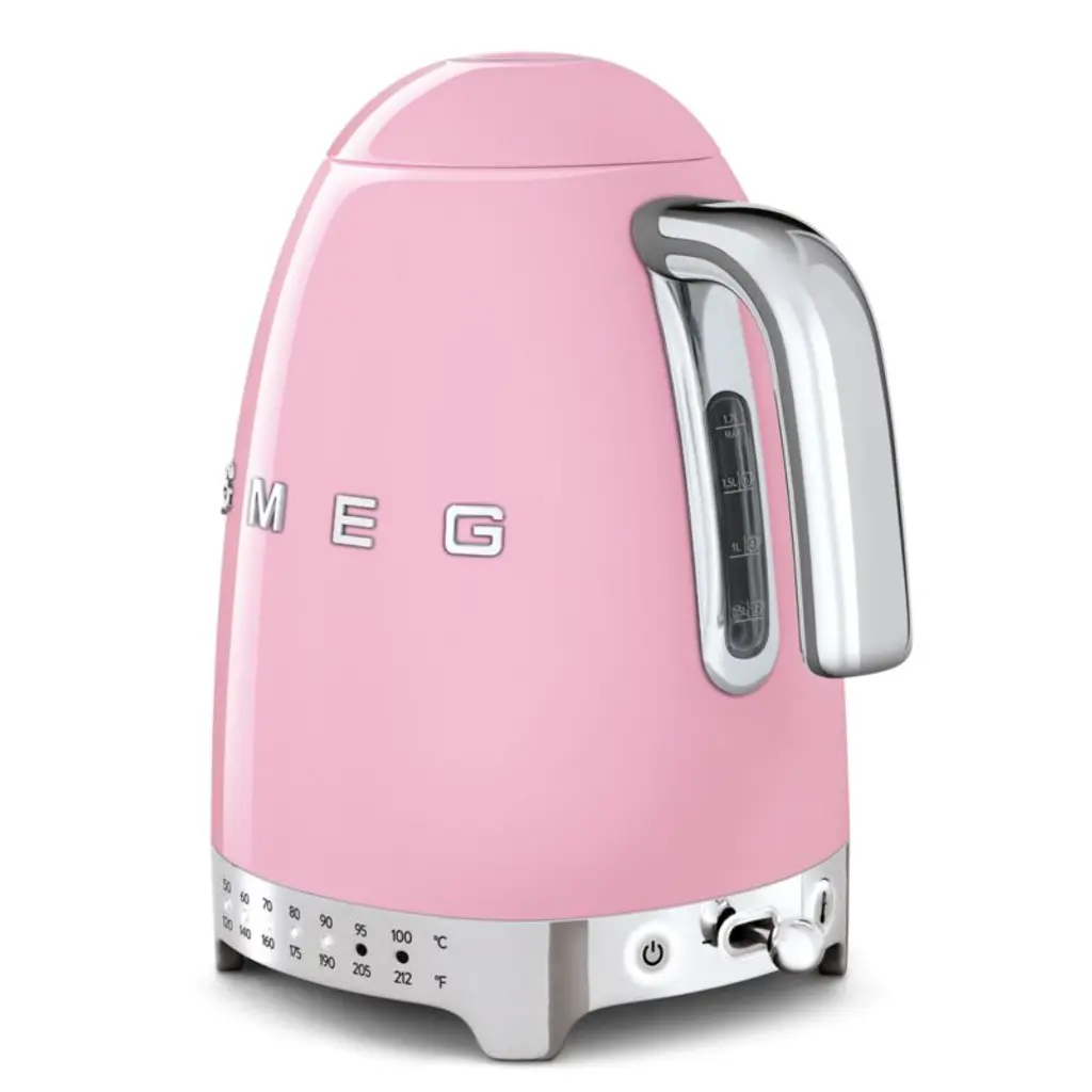 With its charming bullet shape, fun chrome metal accents and pink finish, this electric kettle goes beyond just boiling water. In fact, it offers seven temperature settings to customize for pour-over coffee, tea varieties and personal preference. The soft-opening lid manages steam release, and a swivel base that goes full circle for easy access.Known for its wonderfully retro refrigerators, SMEG has launched a joyfully designed kitchen appliance collection based on the curved and compact lines of postwar design. Incorporating a 1950s-era aesthetic, SMEG's nod to the past is the star of today's kitchen, incorporating all the current advances in technology.