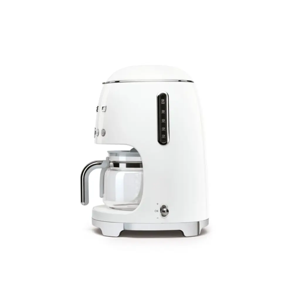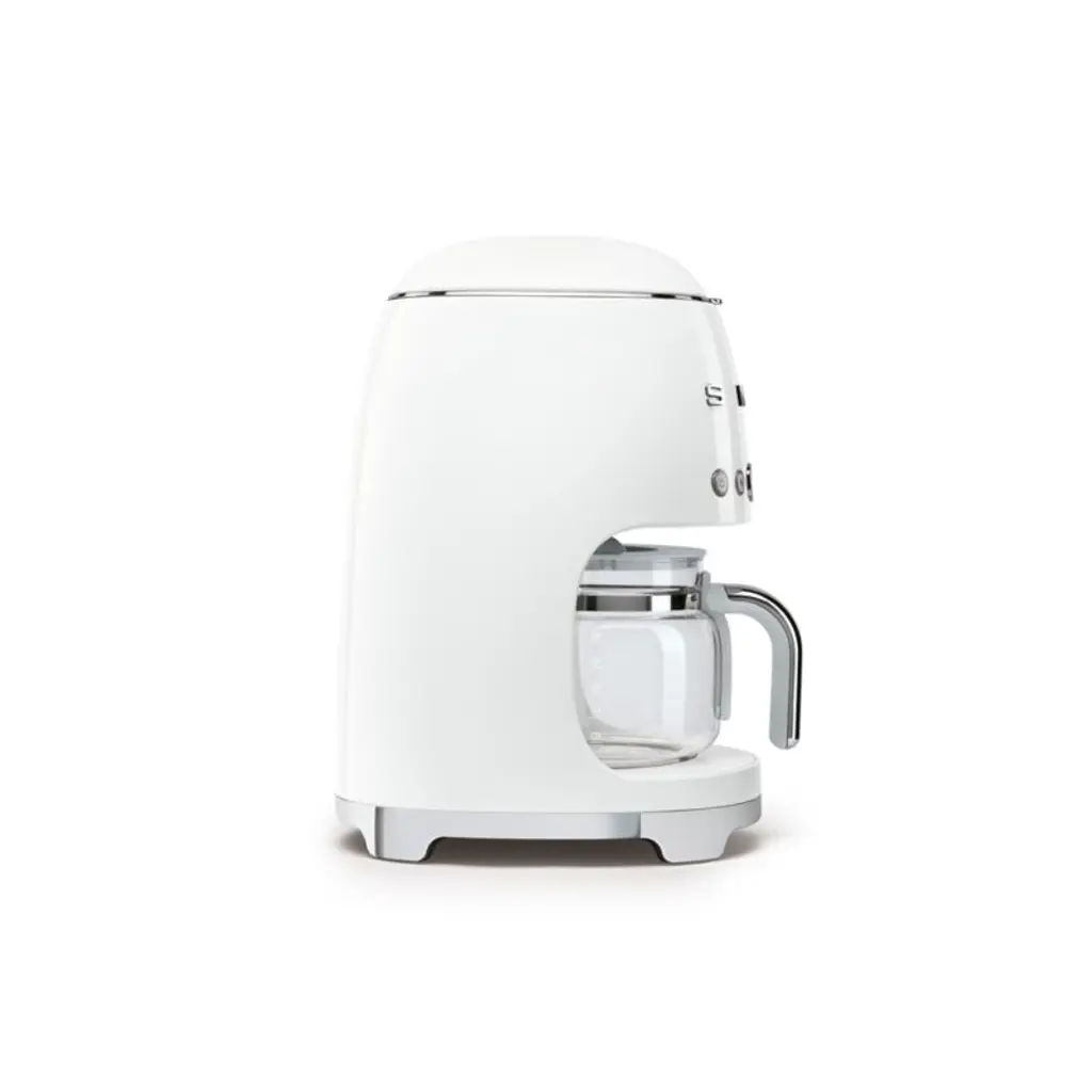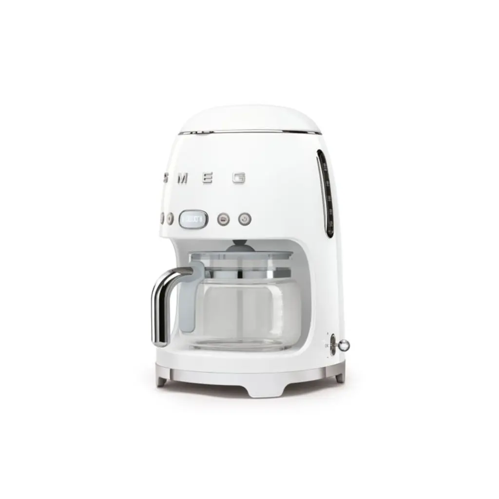 With its charming bullet shape and fun chrome metal accents, this glossy white drip coffee maker delivers up to 10 cups of delicious coffee, adjustable for aroma levels from light to intense. The programmable automatic start ensures coffee is ready right when you need it, and the stainless steel heating plate keeps it warm for up to an hour.Known for its wonderfully retro refrigerators, SMEG has launched a joyfully designed kitchen appliance collection based on the curved and compact lines of postwar design. SMEG's nod to the past is the star of today's kitchen, updated with all the current advances in technology.