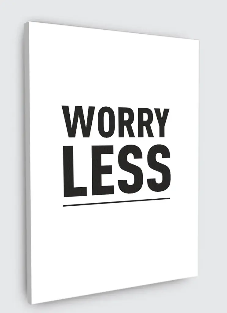 Keep this bold reminder on your wall. "œWorry less"� and live a happy and optimistic life. The simple, monochrome colors scheme used ensures that the message in the text truly stands out with no distractions. It will work well alongside other motivational typographic pieces or even with more artistic canvasses that you may already have in your home. Hang this work of art in rooms where you might need a boost to your moods such as your bedroom or workspace. Another idea is to hang it in your hallway near your front door so it"™s the last thing you see as you exit your home for a day of positive thinking and minimal worrying.Features:- Original design- Gallery quality cotton canvas and solid wood frame- Made in USA- Gallery wrapped canvas art- Sawtooth hangers installed- Wipe with damp cloth