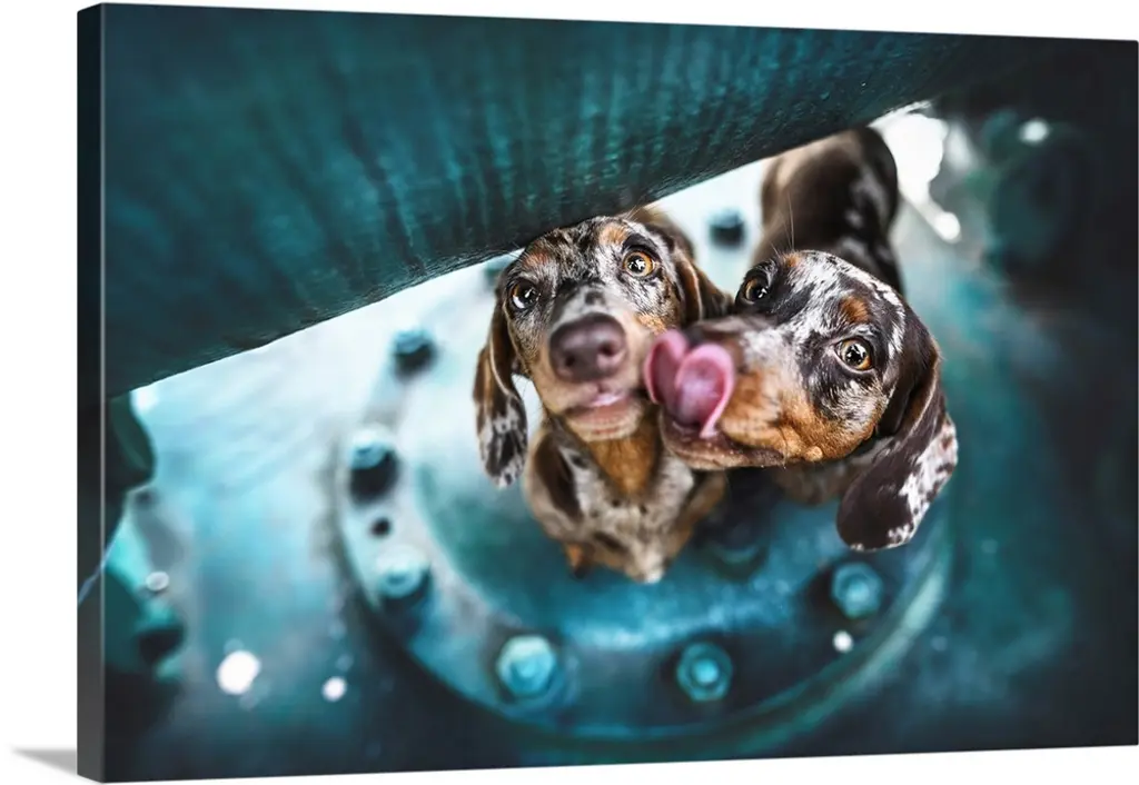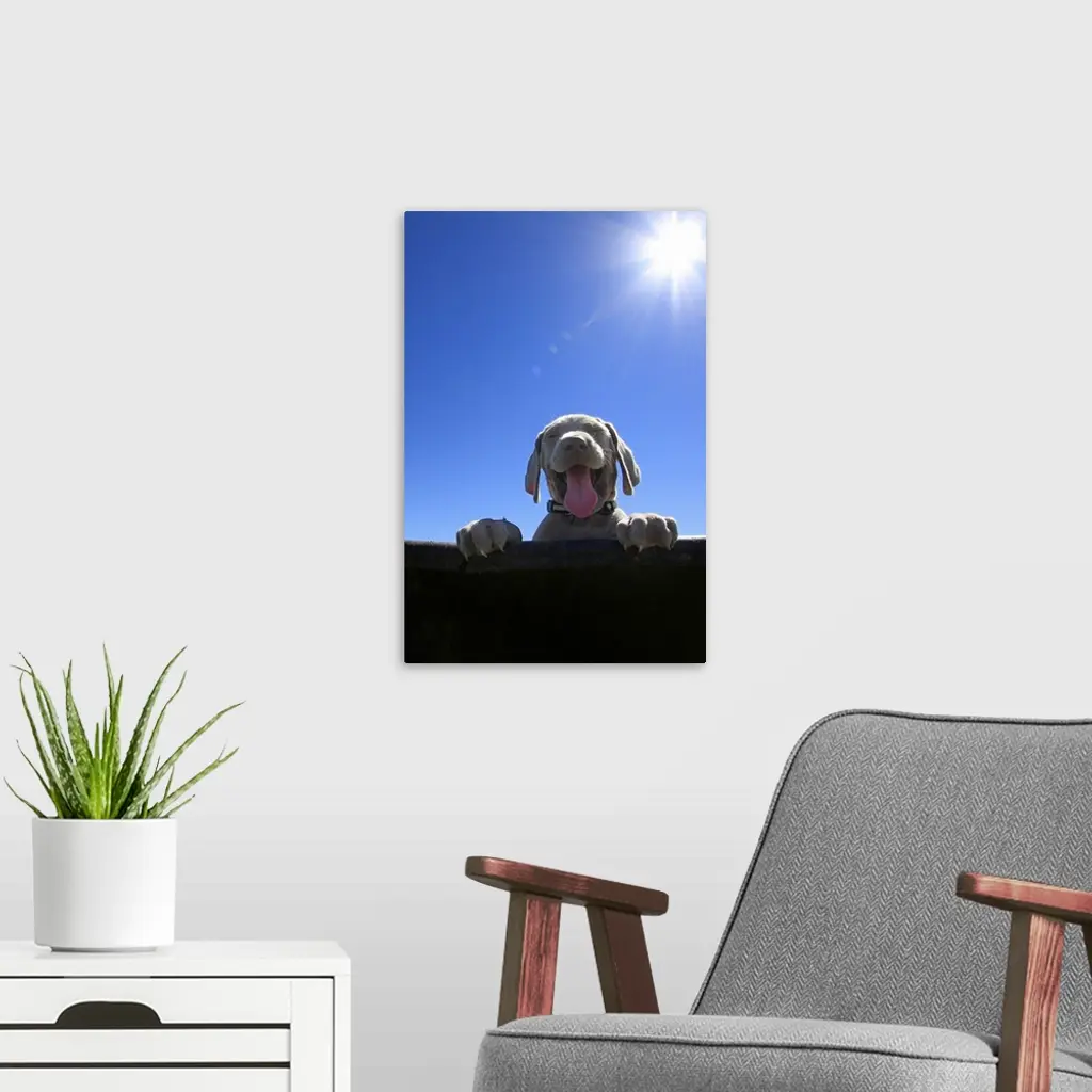 A young weim puppy dog standing behind a fence or in a wheel barrow with paws on top, huge smile with tongue out and eyes closed in bright summer sunlight with sun behind and deep blue sky.