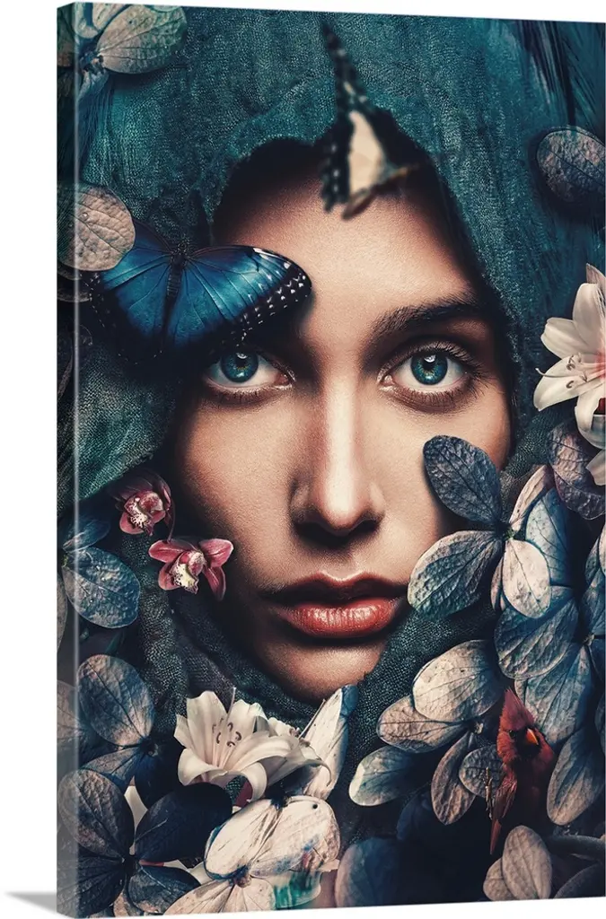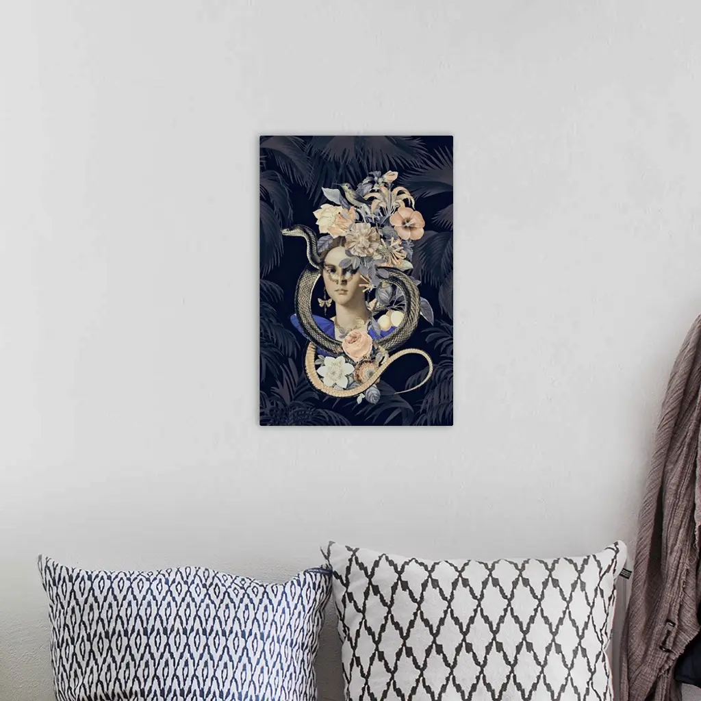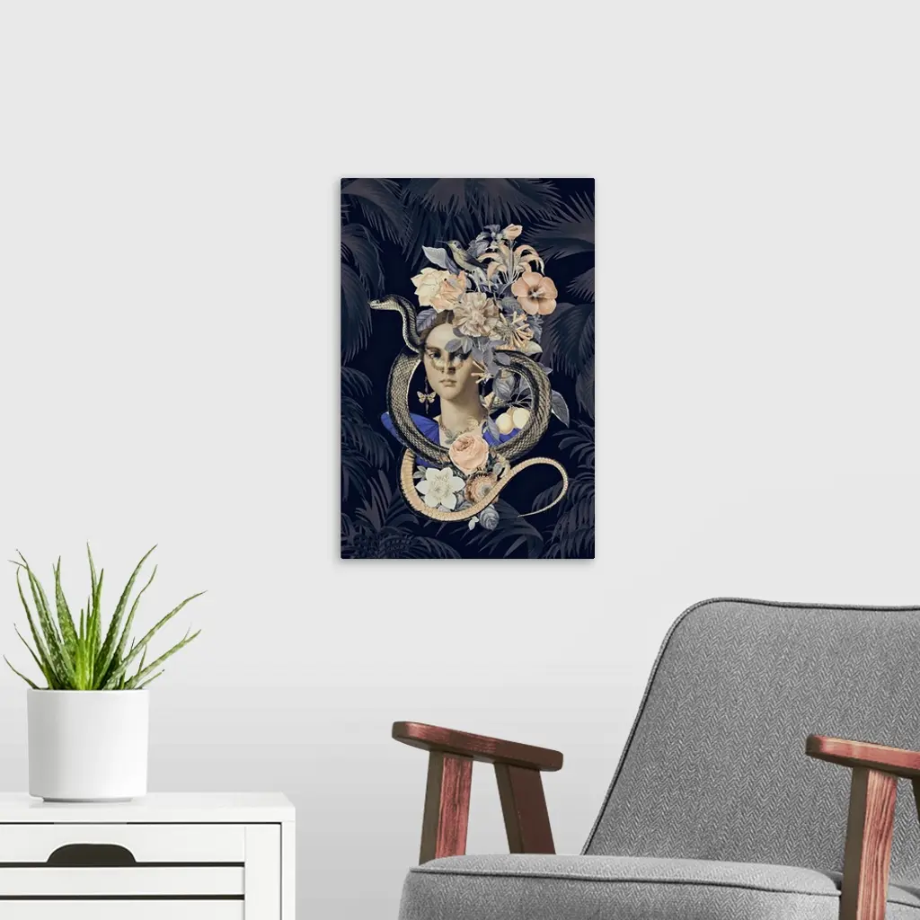 Collage with historical portrait of a woman with exotic flowers and snake.
