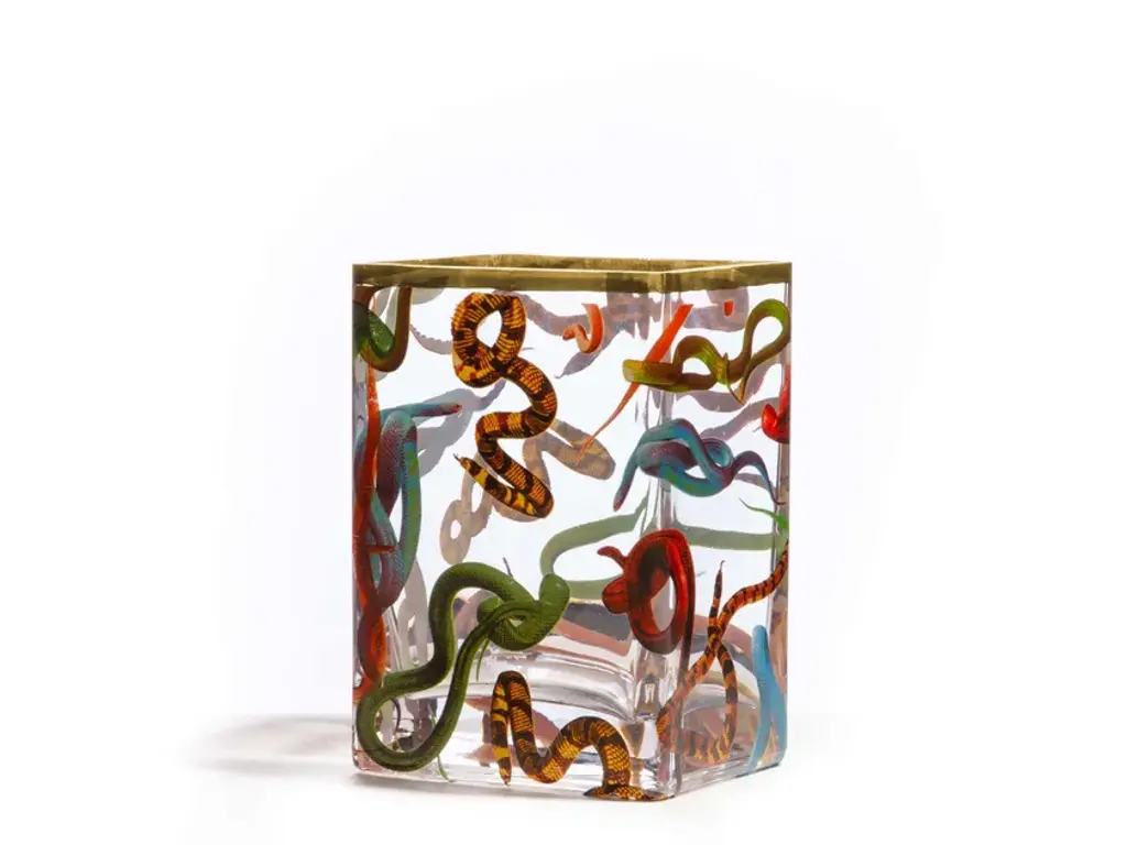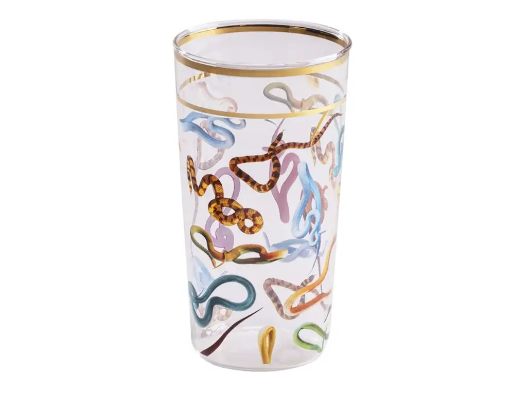 Set of six glasses made of glass with a golden edge. A slightly retro touch for a modern and edgy collection, in classic TOILETPAPER style. They’re perfect for aperitif sipped under a colorful neon light.Material: Borosilicate Glass, Gold