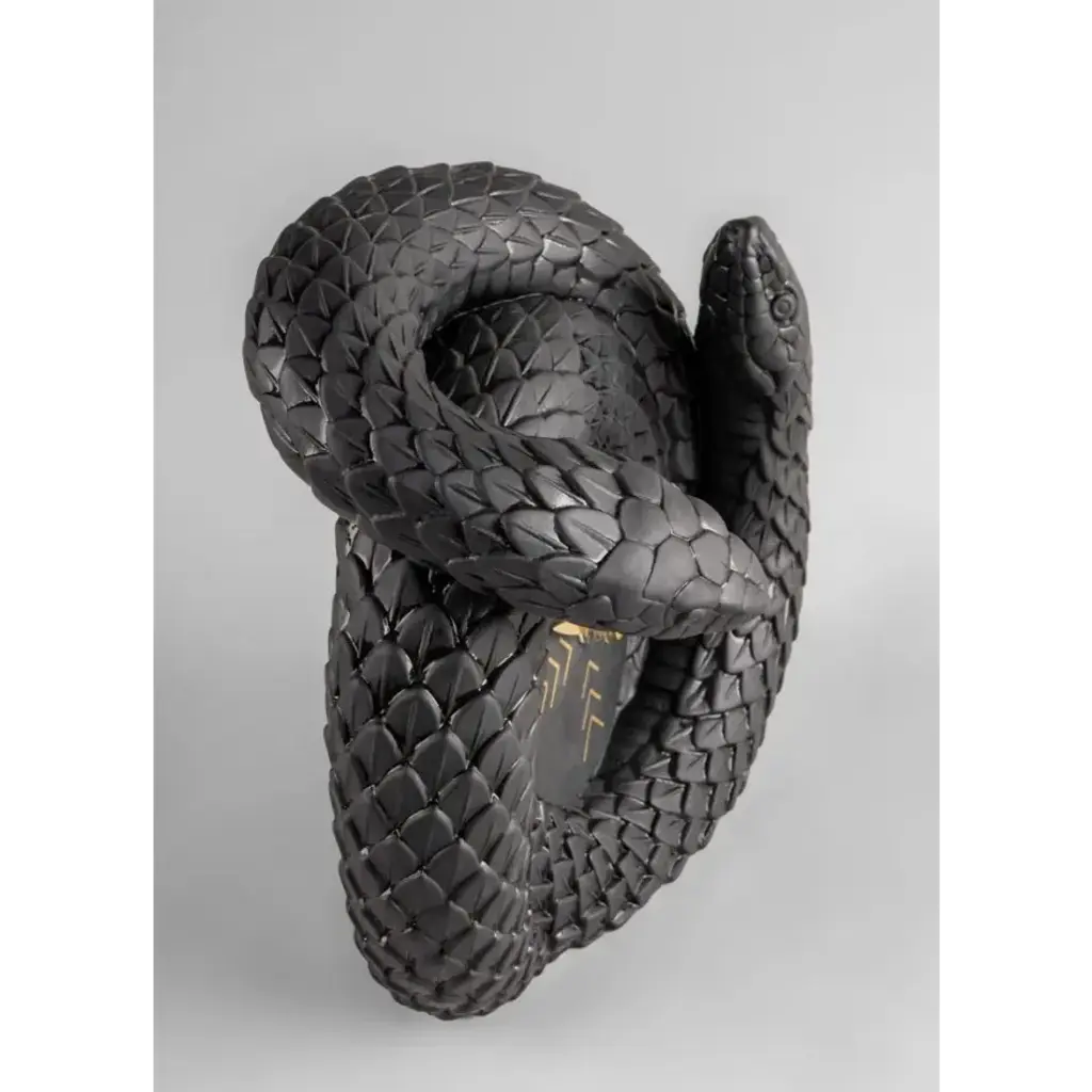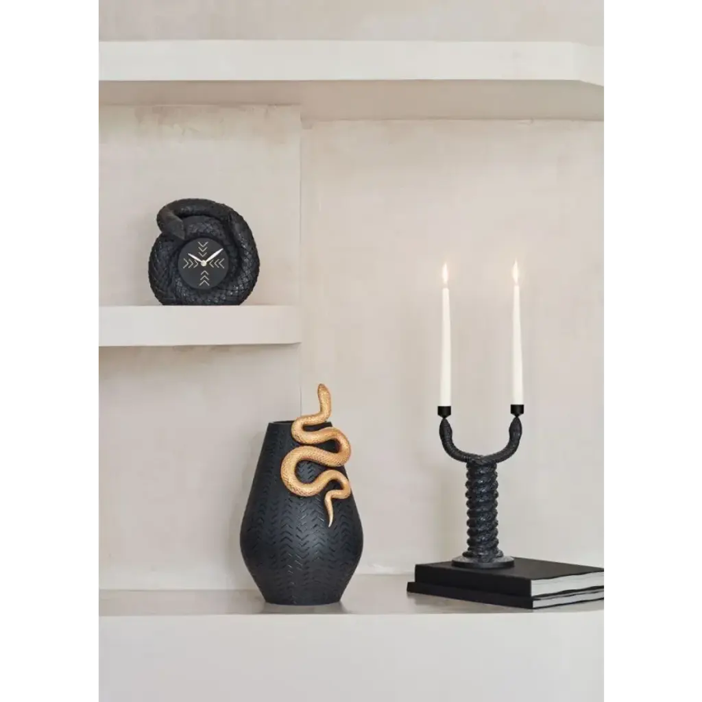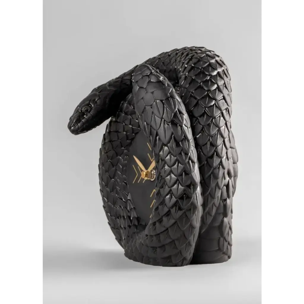 Black porcelain clock with two intertwined snakes. An iconic Spanish brand, Lladro is a world leader in the creation of porcelain art. Started by brothers Juan, Jose and Vicente Lladro in 1953, the ceramic figurines were initially inspired by the works of great European manufacturers like Meissen and Sevres. Over time, a unique style was forged, consisting of elongated lines, a revolutionary single-firing method, and soft pastel tones.