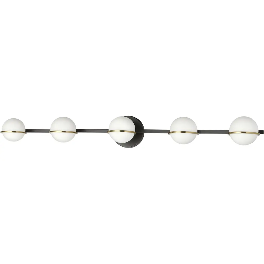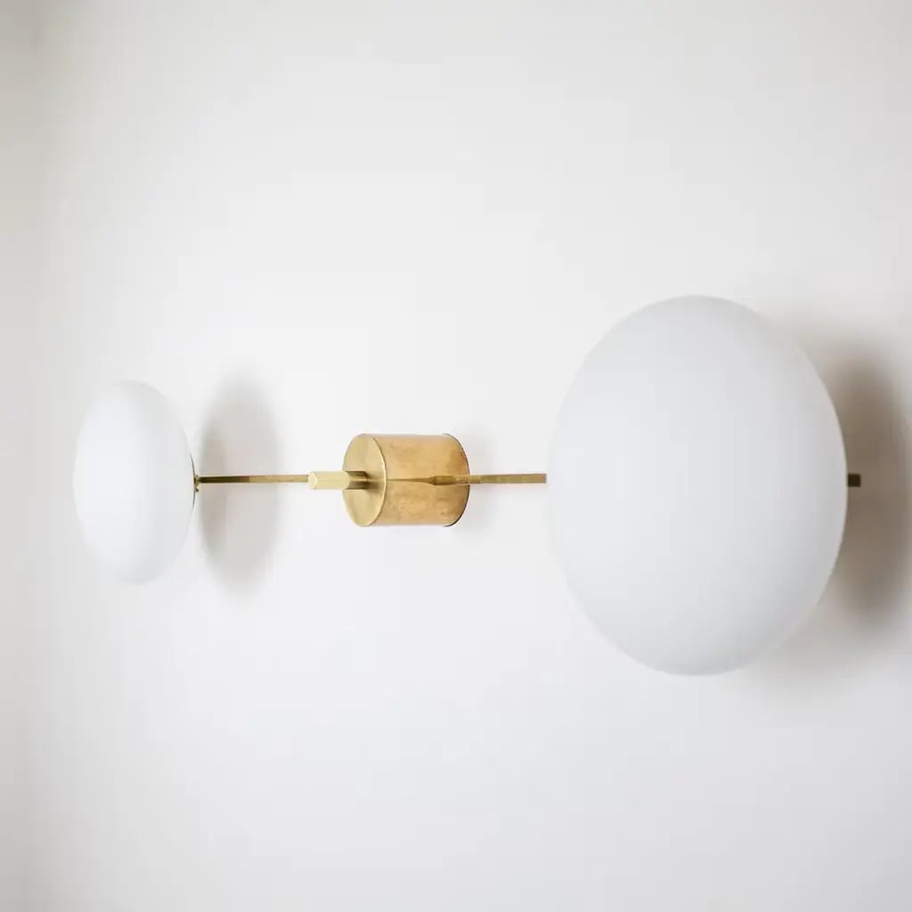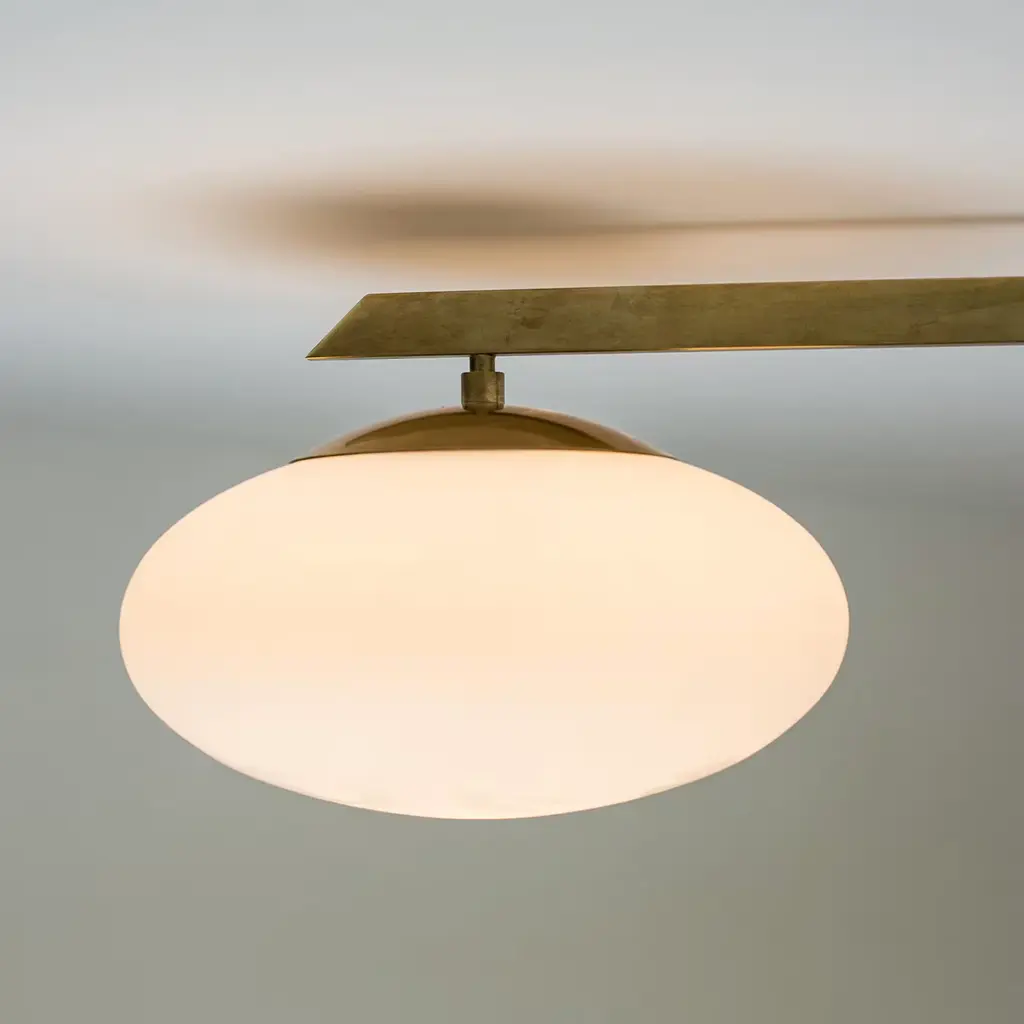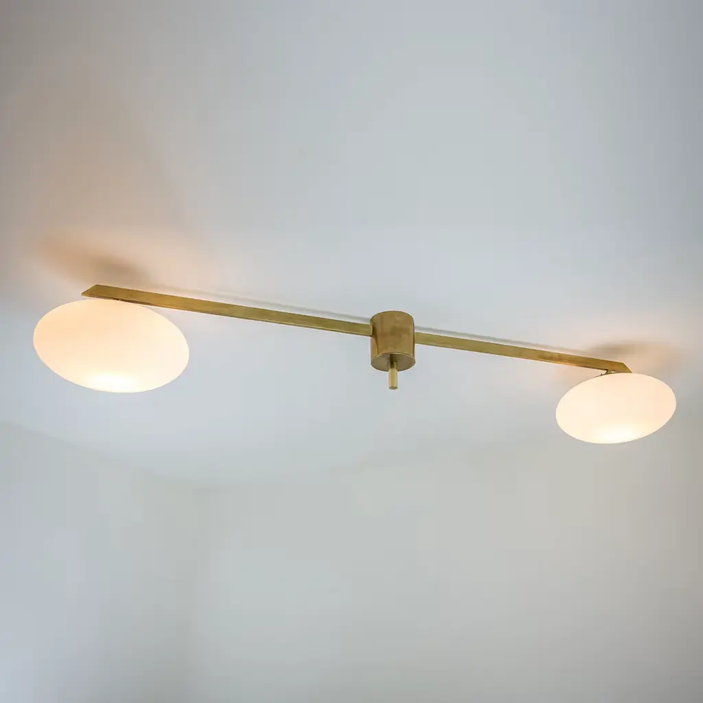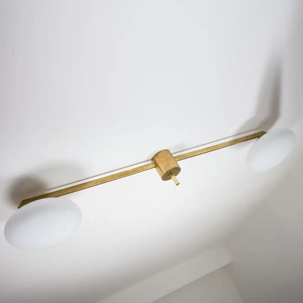 A chic lamp that can be placed both on the ceiling or on a wall. It's made of a brass body that holds two opaline globes at its extremities. It's entirely manufactured in Italy but it can be wired both for Europe and North America. It can work with LED or incandescent light bulbs (not included).