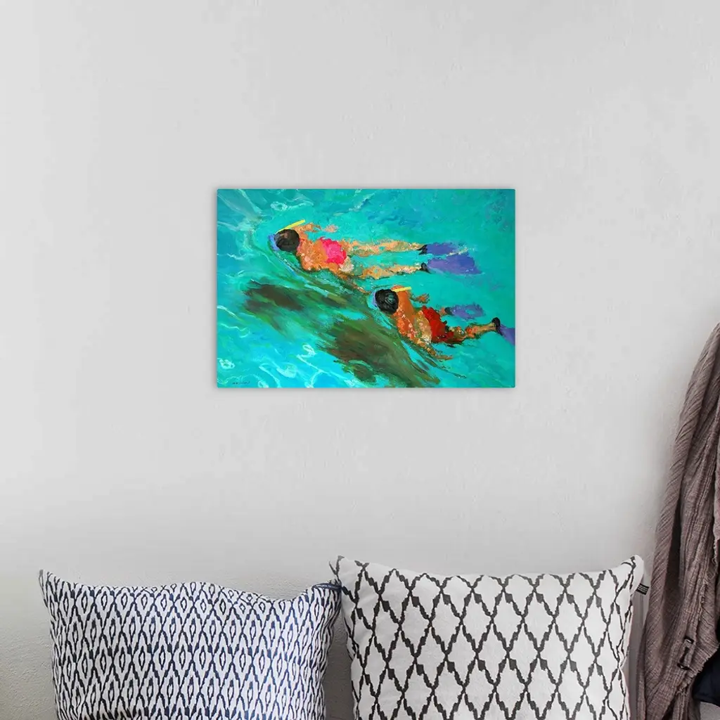 Huge contemporary art shows a man and woman snorkeling through clear water. As the two people travel further in the water, the surrounding water ripples can be seen stemming from their movements.