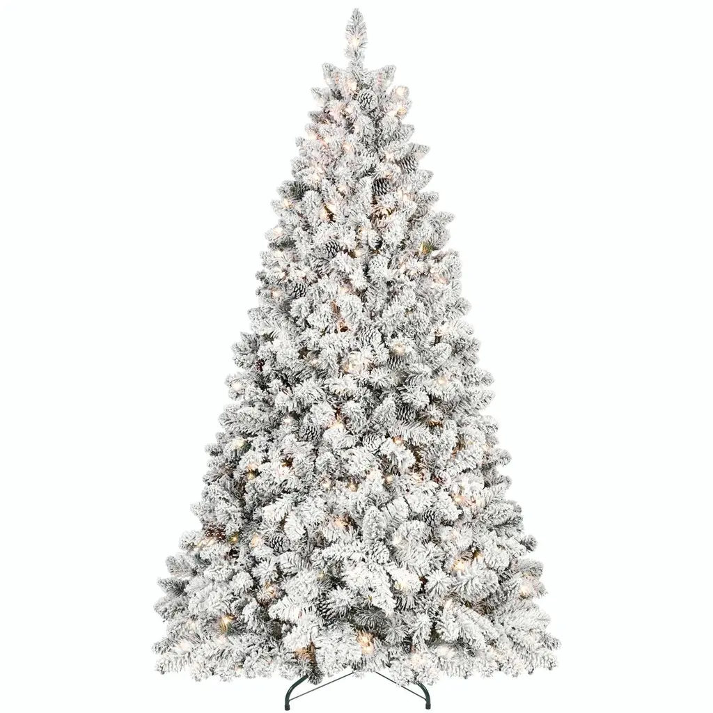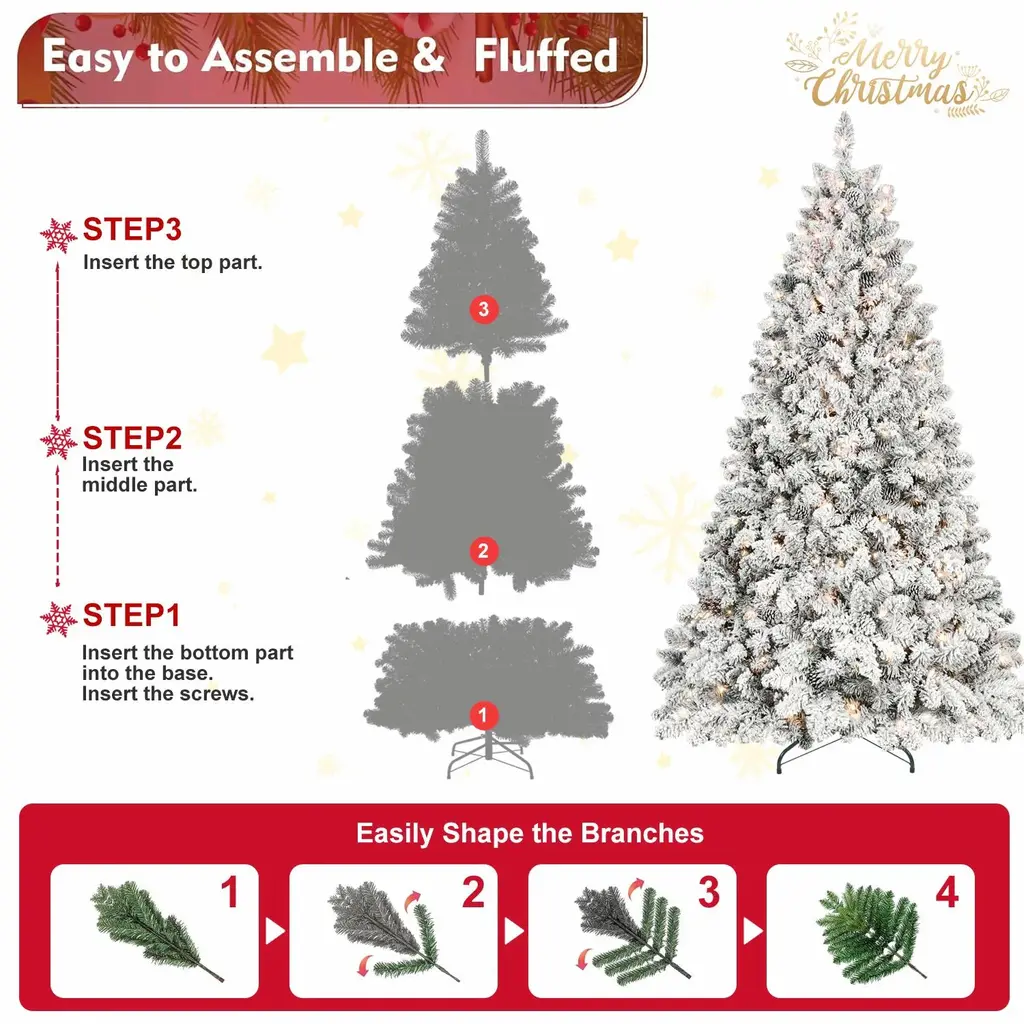 Product FeaturesSnow-Flocked Christmas Tree with Pine Cone Design: This snow-flocked Christmas tree with a delightful pine cone design is an excellent way to spread holiday cheer this season. With its sturdy branches, it can hold garlands and all your favorite ornaments, offering you the flexibility to create a customized look that suits your taste. It's the perfect addition to your holiday decor, making the season feel complete.Hinged Design for Easy Setup: The Christmas tree boasts a hinged design that simplifies fluffing and assembly, saving you a significant amount of time and effort. The hinged construction makes it easy to set up and achieve a full, beautiful look in no time. Additionally, the tree can be easily separated into 3 sections and stored in a convenient storage bag, providing hassle-free storage for future use.Durable and Sturdy X-Stand: Our snow-flocked Christmas tree features a robust, foldable X-stand, superior to plastic alternatives in stability and longevity. It ensures the tree stands straight for years, while its compact design offers convenient storage for the next holiday season. Enjoy enduring beauty and hassle-free setup with our durable metal stand.9ft Snow-Flocked Christmas Tree for a Wintry Feel: The 9ft snow-flocked Christmas tree creates a unique and wintry atmosphere, making it an eye-catching addition to any space. It's perfect for enhancing the Christmas ambiance at home and celebrating the holiday season with family members. Alternatively, it can be placed in shops to attract customers and create a festive setting.Professional and Rich Style: With many years of experience in designing and producing Christmas trees, we offer a variety of high-quality styles to suit various preferences. Our artificial trees come in different heights and tip counts: Light counts (for different heights): Fluffing times (for different heights): Choose the style you love and use it to decorate a warm and wonderful holiday season!