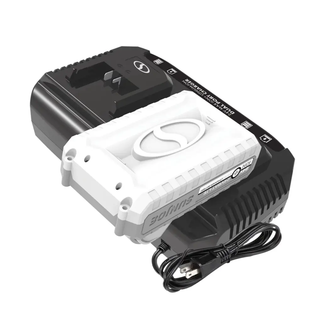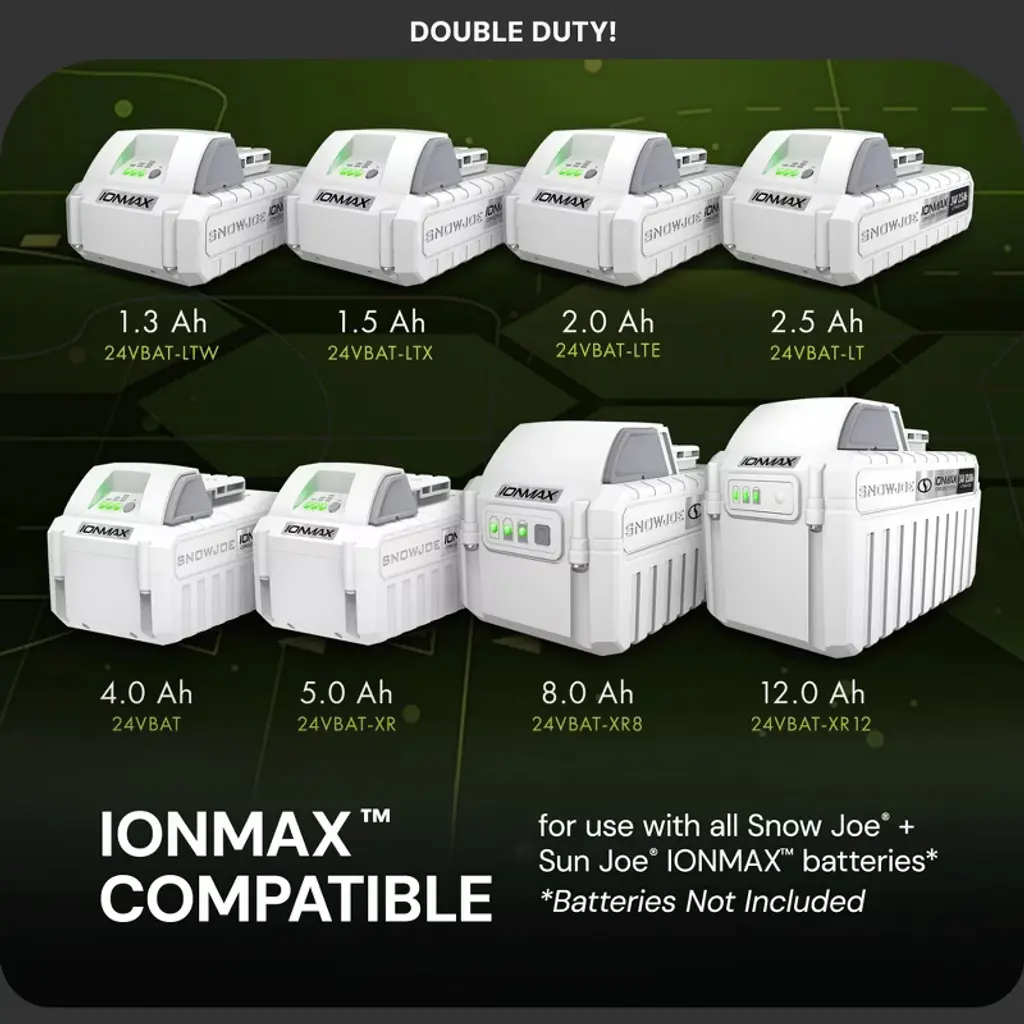 Keep your Snow Joe and Sun Joe tools powered up and ready to go with the Snow Joe 24-Volt IONMAX Dual Port Quick Charge Docking Station Charger. This high-performance charger is designed to work exclusively with IONMAX 24-Volt lithium-ion batteries, including models 24VBAT-LTX, 24VBAT-LTW, 24VBAT-LTE, 24VBAT-LT, 24VBAT, 24VBAT-XR, 24VBAT-XR8, and 24VBAT-XR12. It even supports ECOSHARP IBAT24 batteries like iBAT24-LTE and iBAT24-XR. The 24VCHRG-DPC charger features rapid charging technology that fully charges up to two IONMAX batteries in just 2.5 hours, so you can get back to work in no time—no more juggling two batteries on a single charger. Its compact design and dual-port functionality allow you to charge two batteries simultaneously, providing more power and less downtime. For safety, the charger is equipped with thermal, over-voltage, and over-current circuit protection to safeguard your batteries from damage during charging. A built-in battery status indicator lets you easily monitor the charge level of each battery. Weighing just 1.5 lbs, this lightweight charger is easy to handle and transport, making it perfect for any job site, whether you're at home, in the garden, or on the go. Stay charged and ready to work with the Snow Joe 24-Volt Dual Port Quick Charge Docking Station, the ultimate accessory for your Snow Joe and Sun Joe tools.