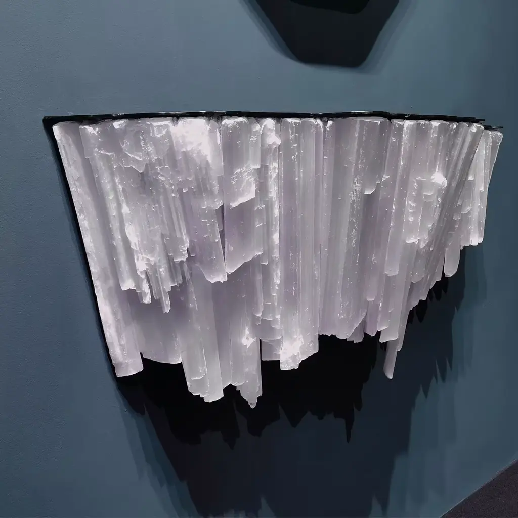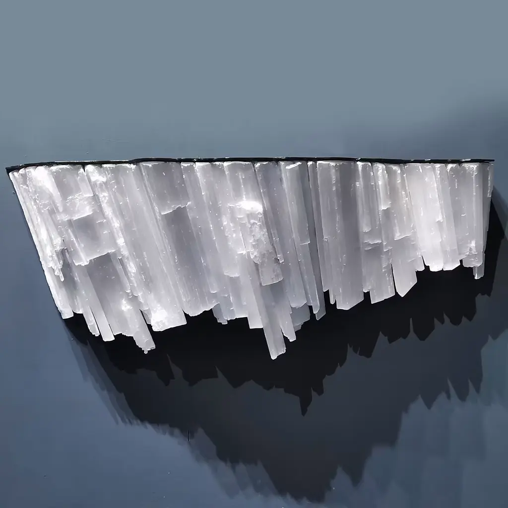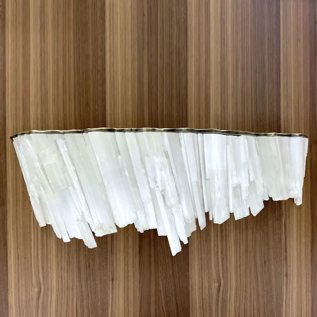 The purity of a frozen waterfall meets the functionality of an entryway console in this sculptural design, which is sure to immediately capture the eye. Eccentric and evocative with its suspended body covered in split selenite, it comes complete with a shaped bronze-finished brass top. The console belongs to an exclusive limited series counting only five pieces. Please contact the Concierge for available customizations.