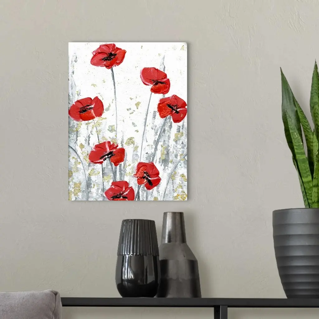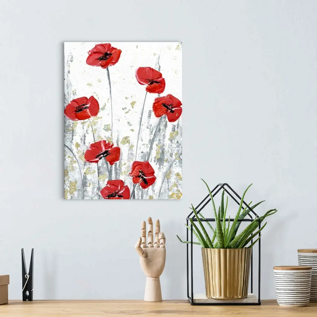 Red Poppy Flowers on white and gray background with metallic gold all over.