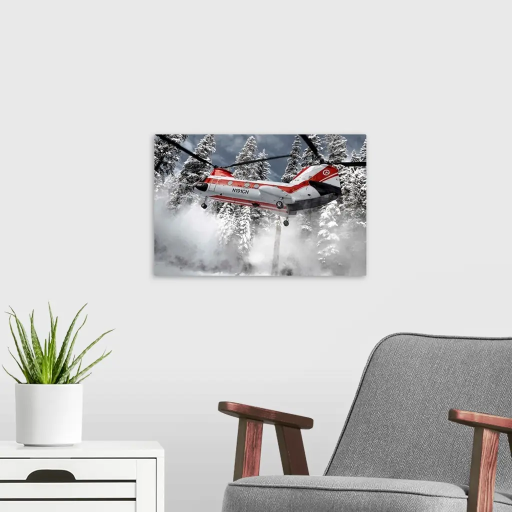 A helicopter lifts up off the ground, sending snow flying away.