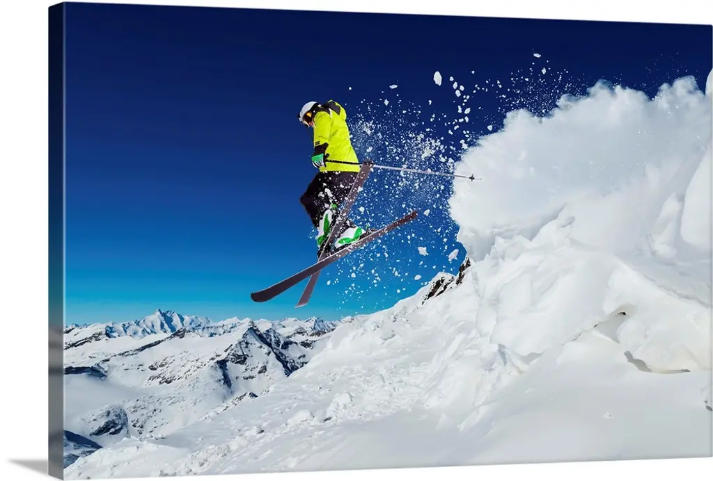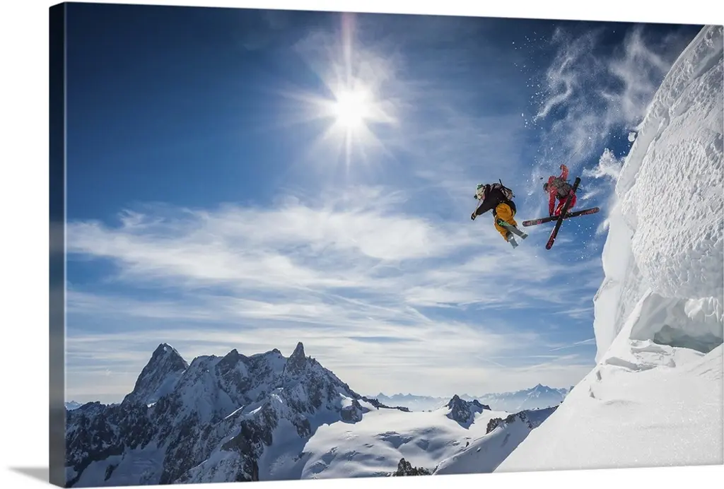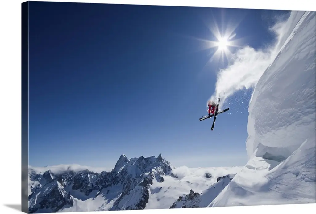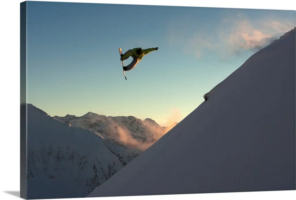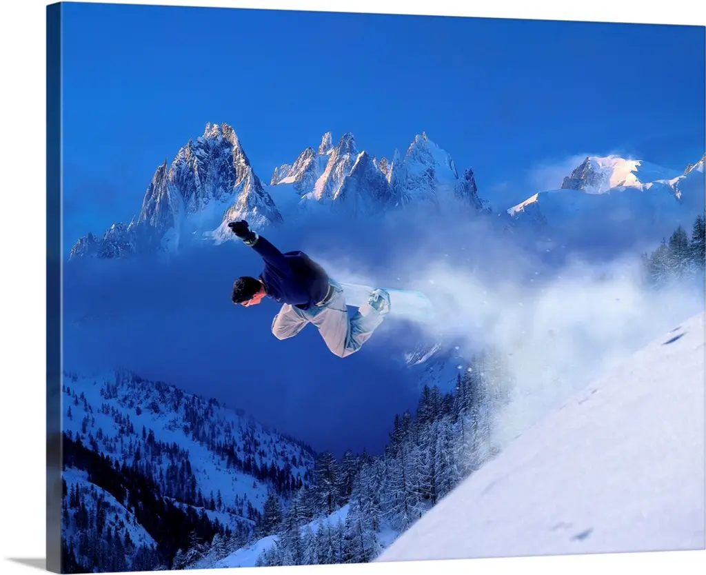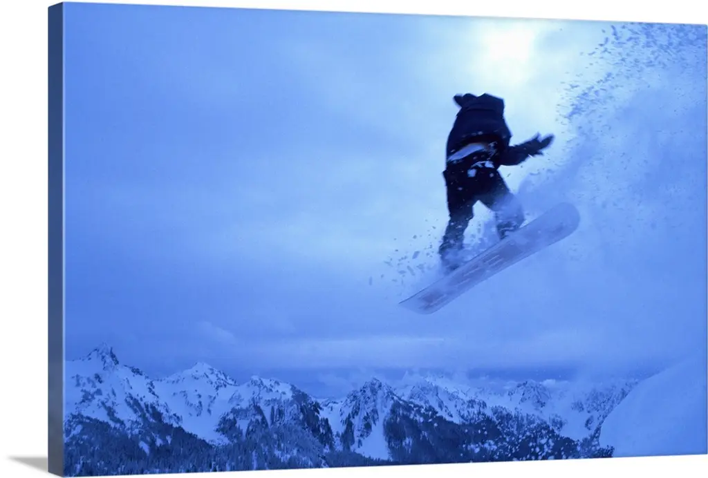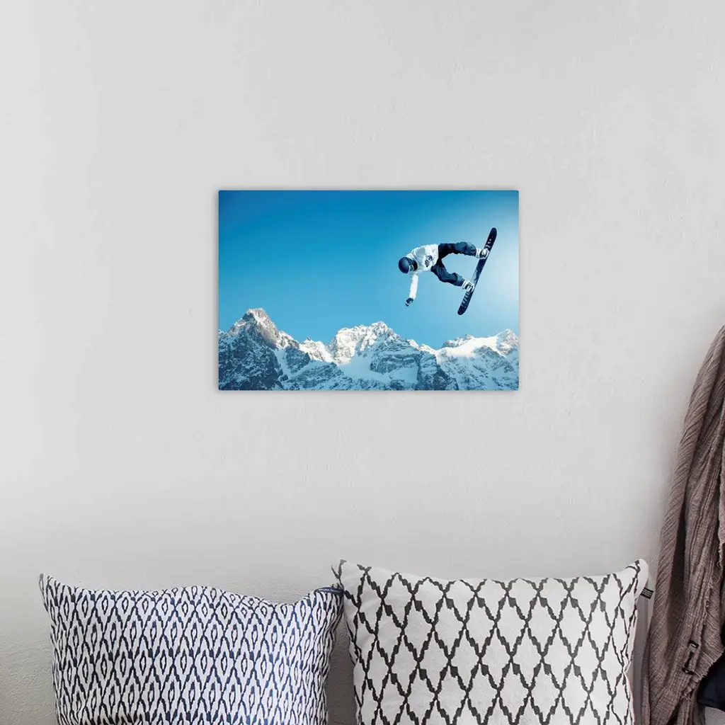 Snowboarder making jump high in clear sky, with mountains in the background.