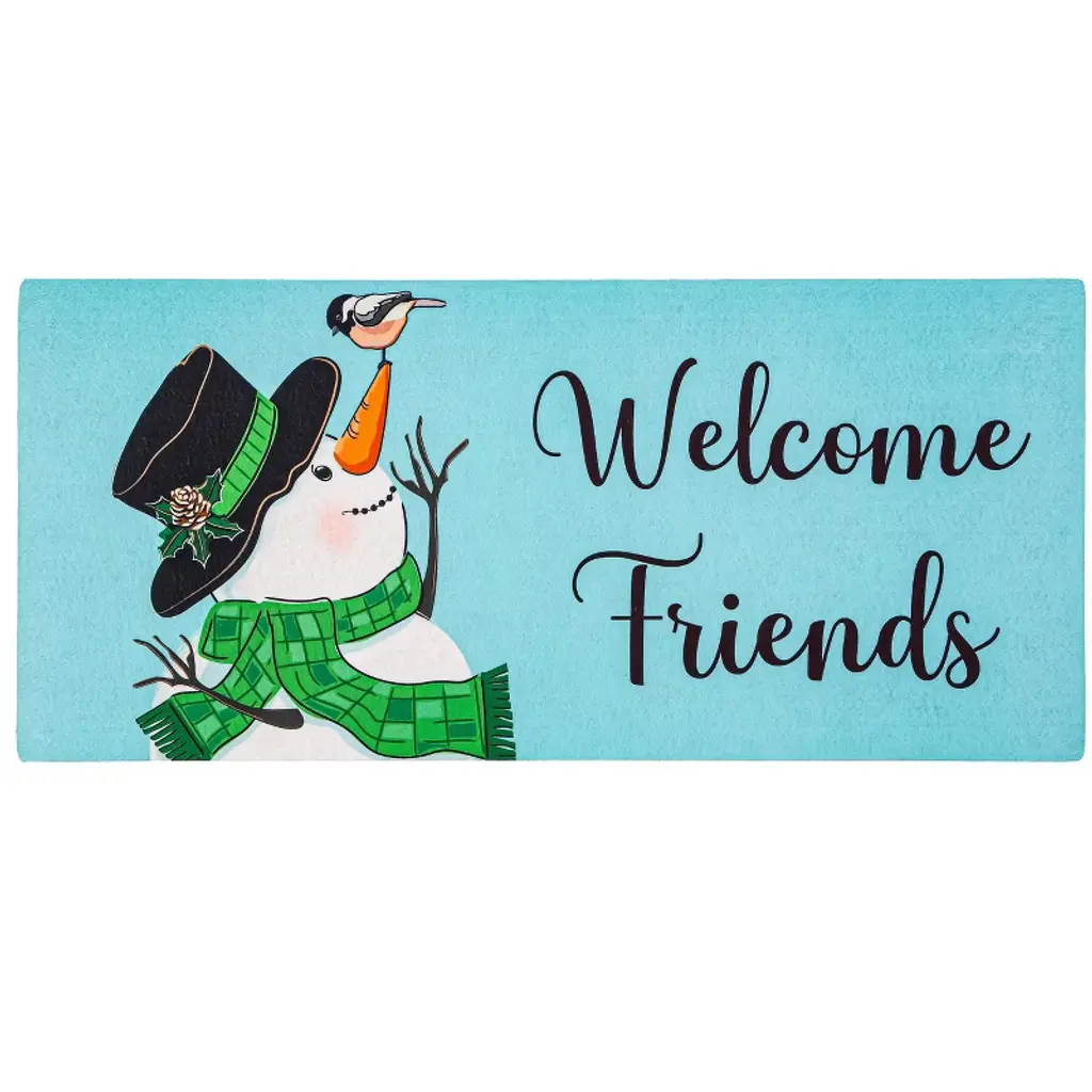 Welcome everyone from the family to Santa Claus himself home with this Sassafras switch mat. It features a friendly snowman wearing a cozy hat and scarf with a sweet, feathered friend sitting on his nose.