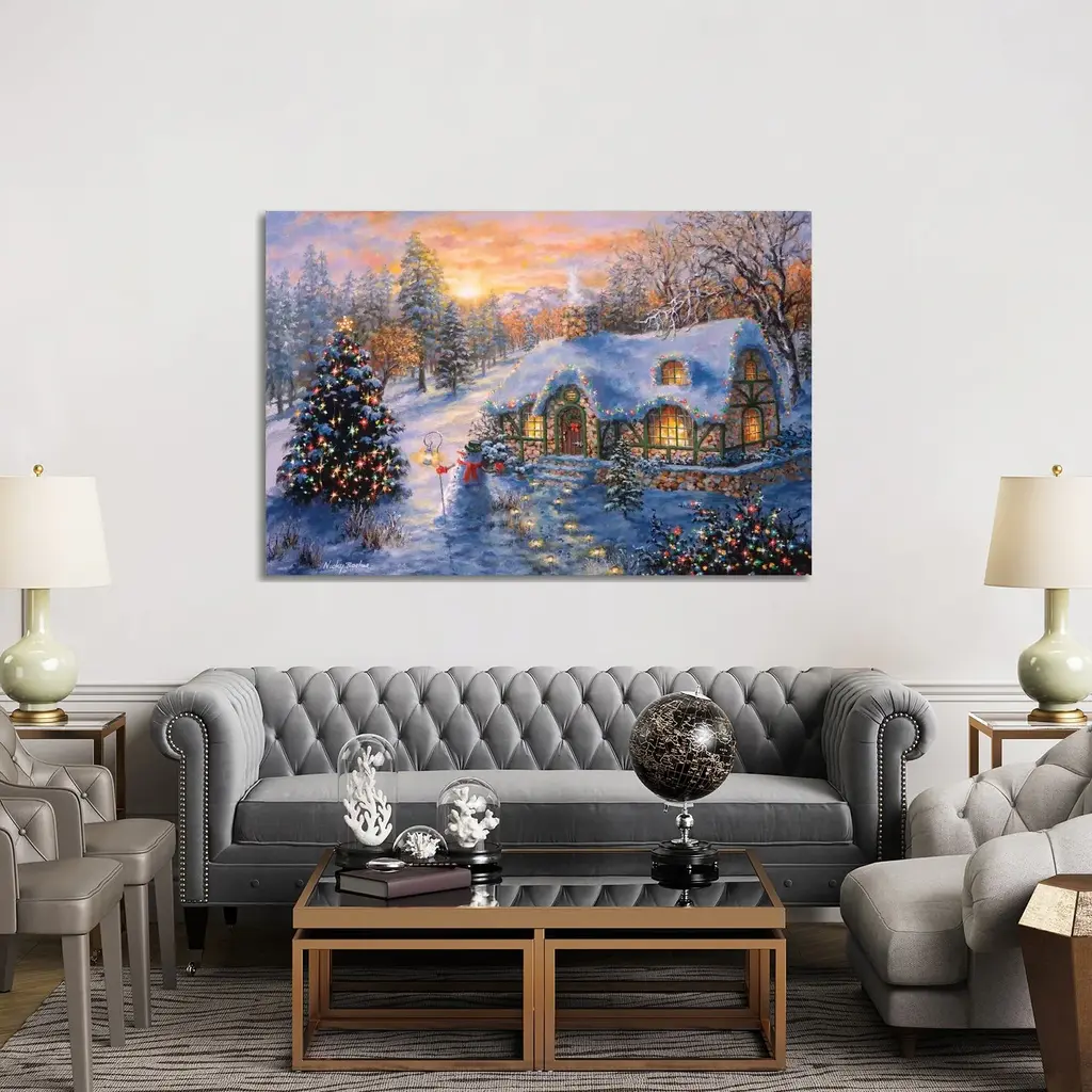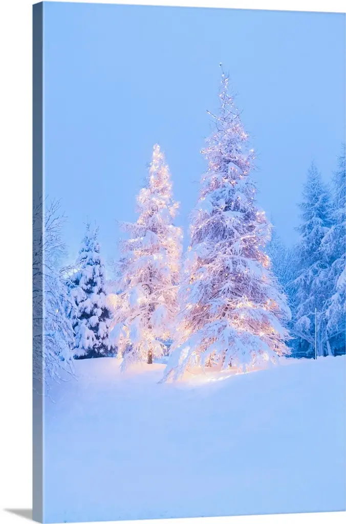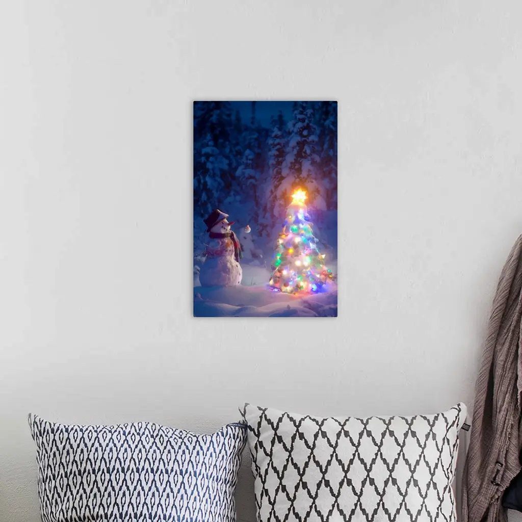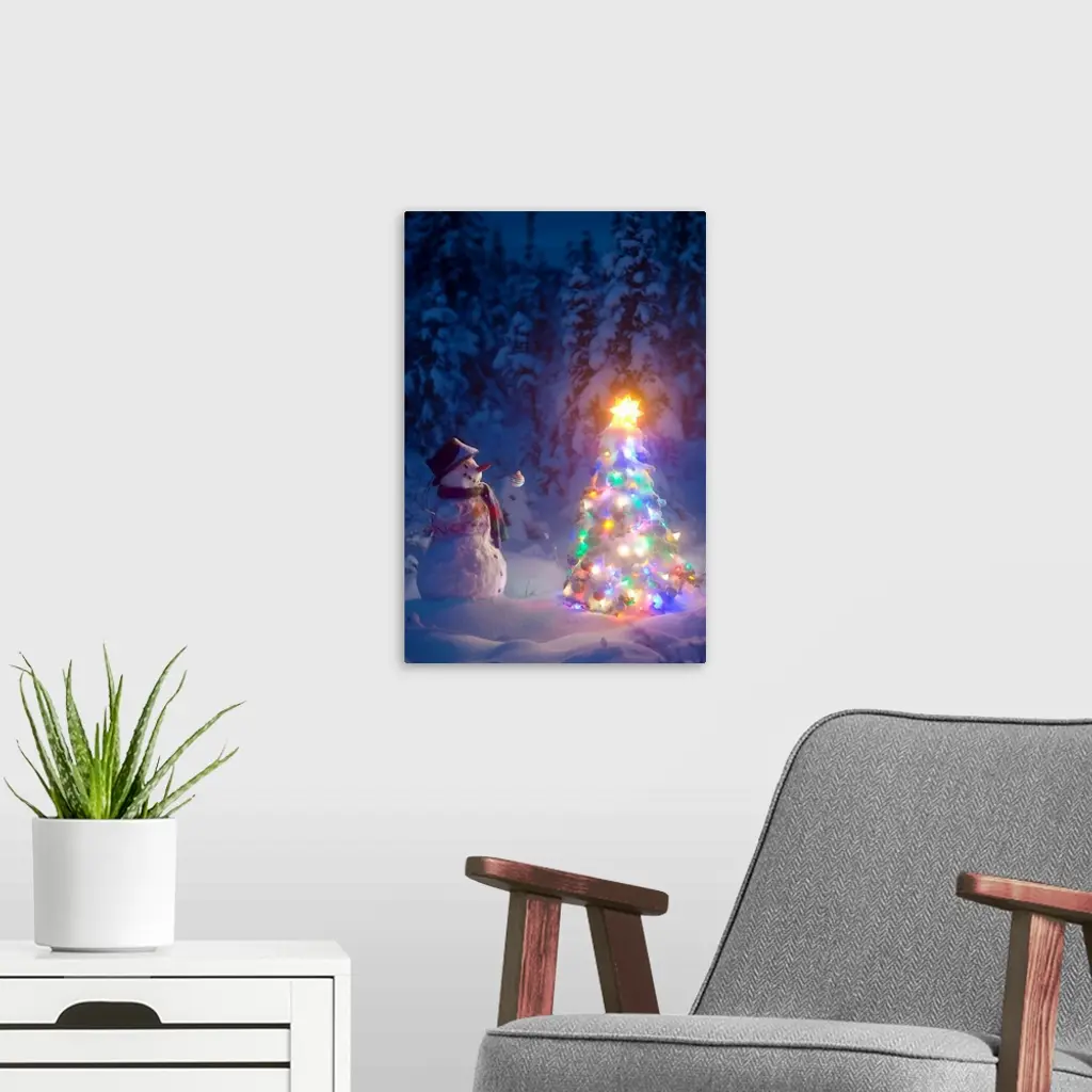 Festive scene of a snowman happily looking upon a Christmas tree covered in lights and a glowing star in a snowy forest.