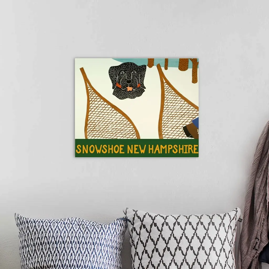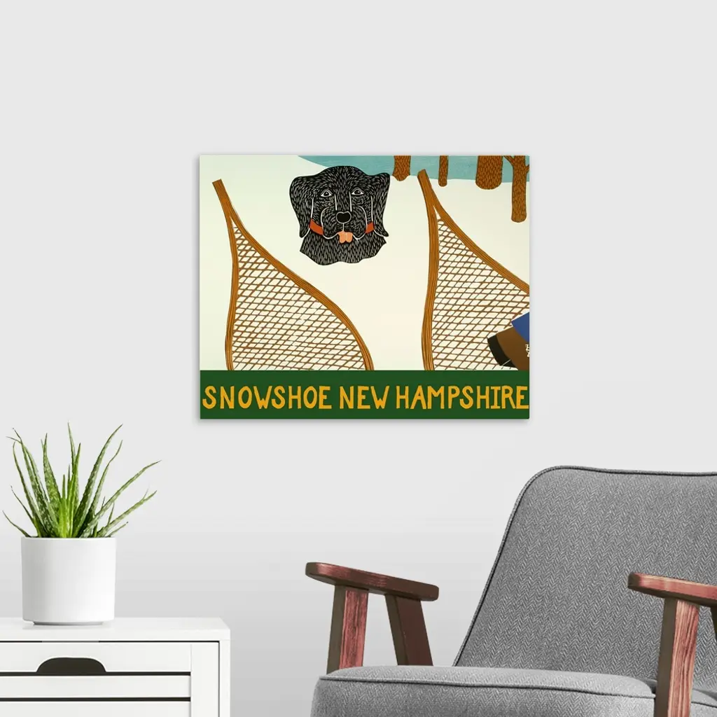 Illustration of a black lab buried in the snow with a set of snowshoes in front of it and "Snowshoe New Hampshire" written on the bottom.