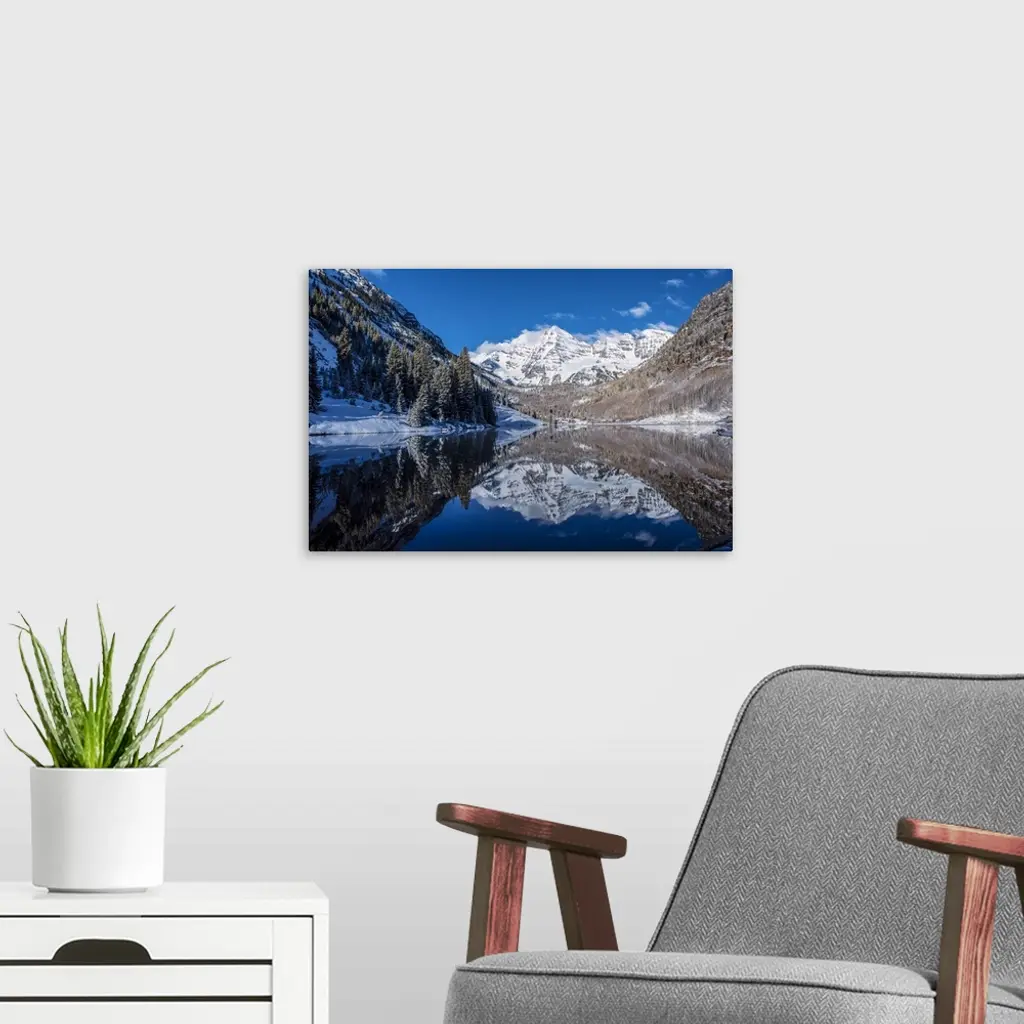 Snowy peaks of the Maroon Bells mirrored perfectly in the waters of the Maroon Lake below, Aspen, Colorado.