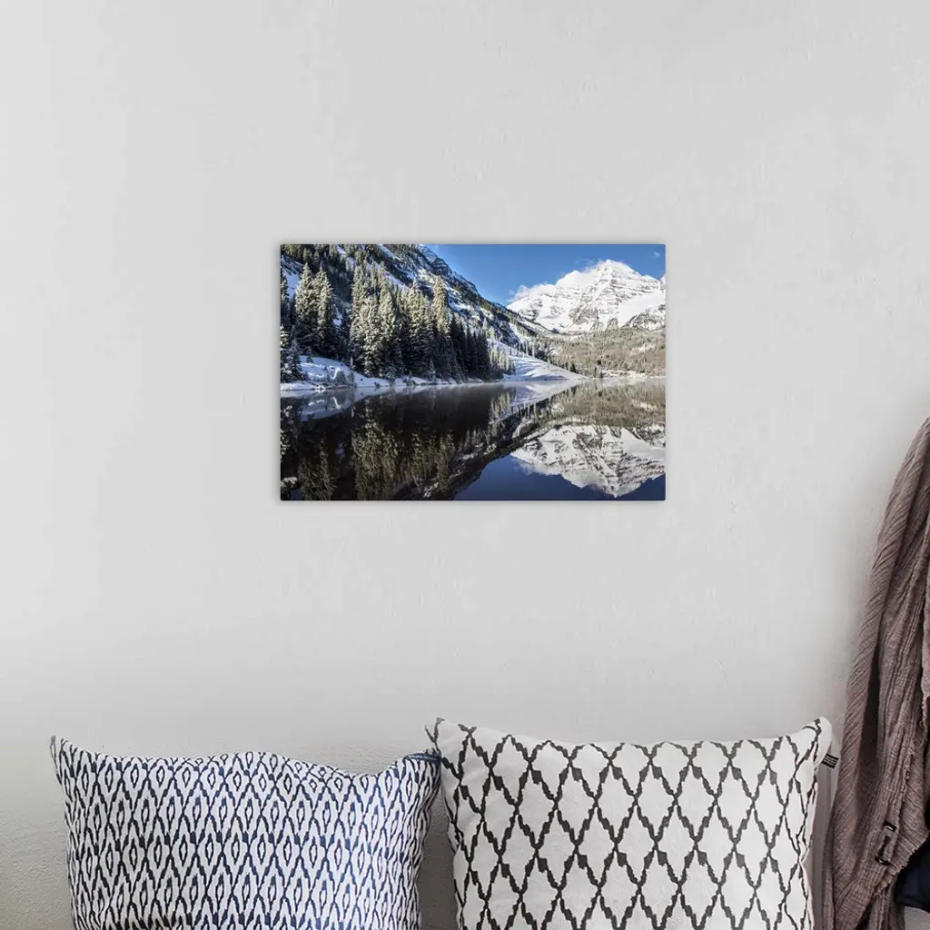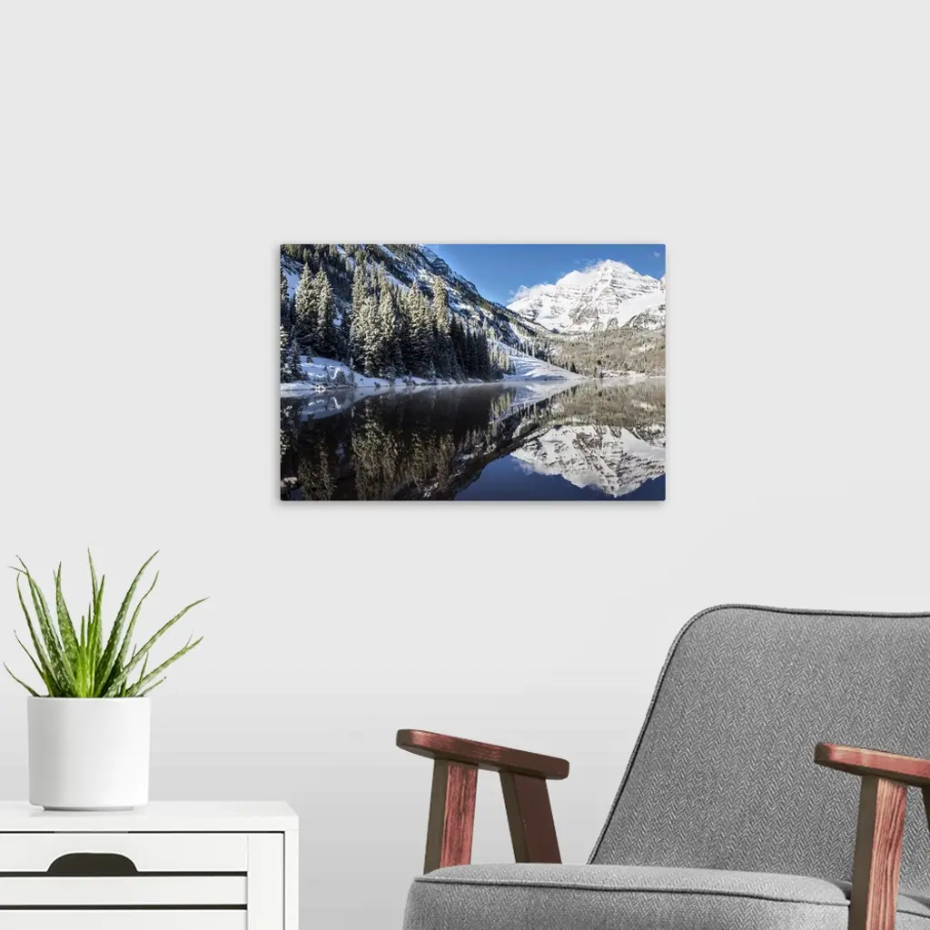 Snowy Maroon Bells Mirrored In Maroon Lake Below, Aspen, Colorado