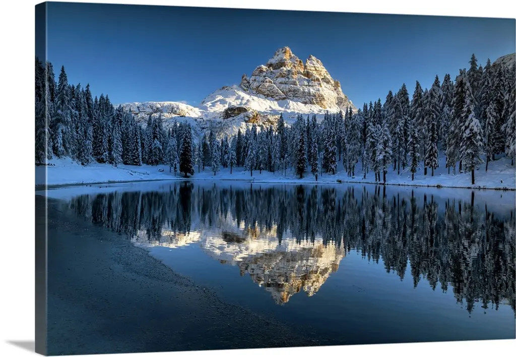Snowy peaks of the Maroon Bells mirrored perfectly in the waters of the Maroon Lake below, Aspen, Colorado.