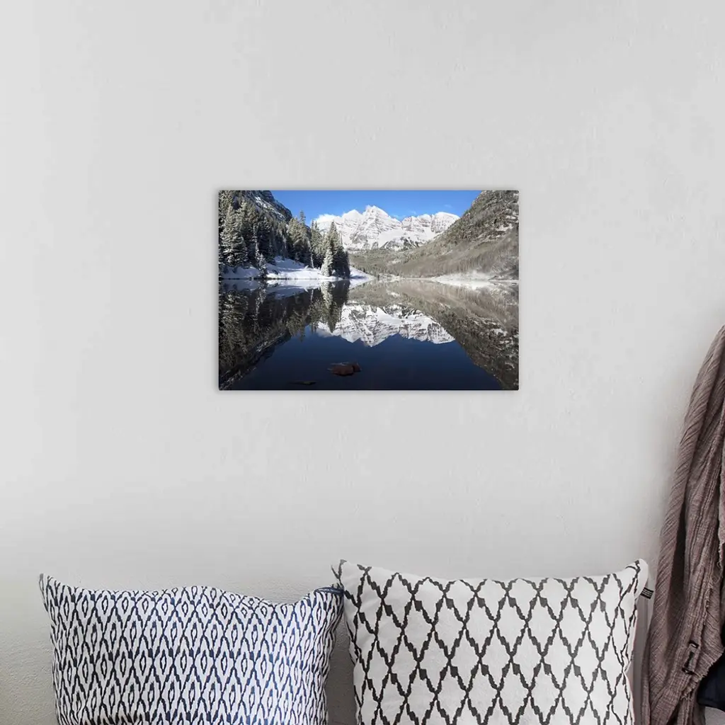 Snowy peaks of the Maroon Bells mirrored perfectly in the waters of the Maroon Lake below, Aspen, Colorado.