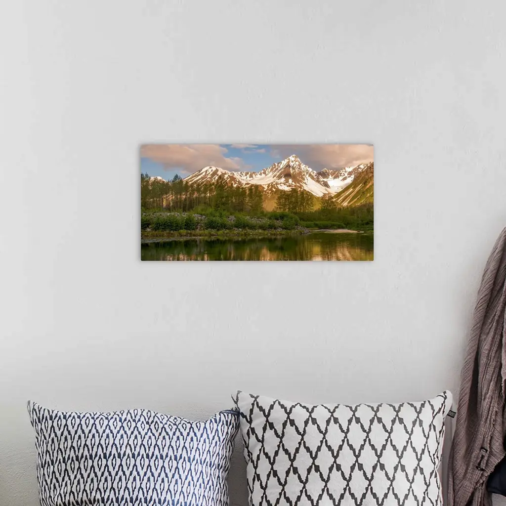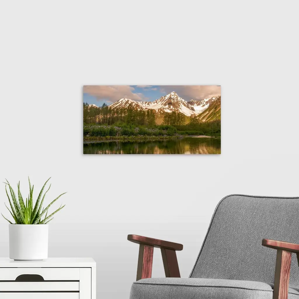 Landscape photograph of a lake in front of snowy mountain peaks with warm lighting.