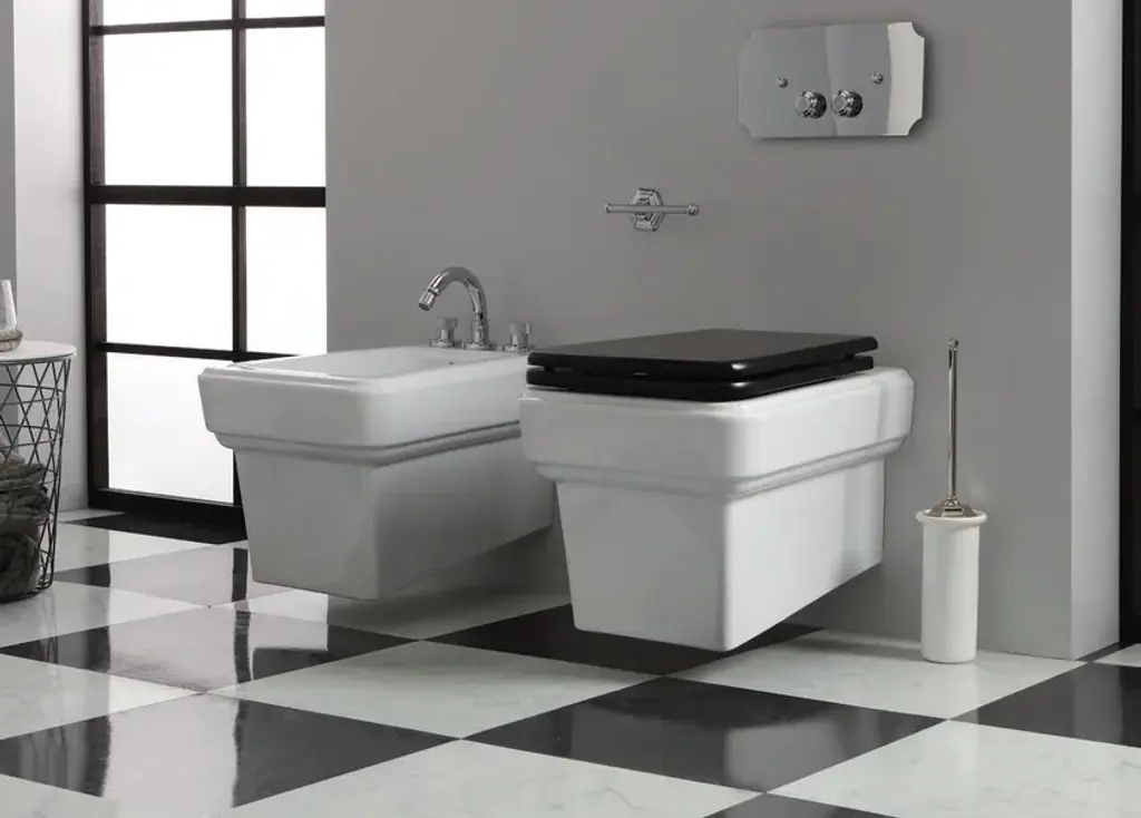 The SoFifties ceramic toilets are inspired by America in the 1950s. They exist with many matt or glossy colors (old white, black, gray, dark brown, light brown, ...) and in several models (floor mounted or suspended wc pan, monobloc toilet and high level cistern with chain and handle).Toilet Seat not included