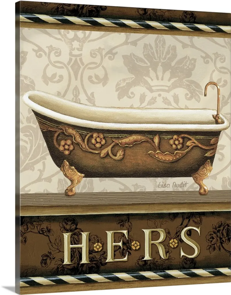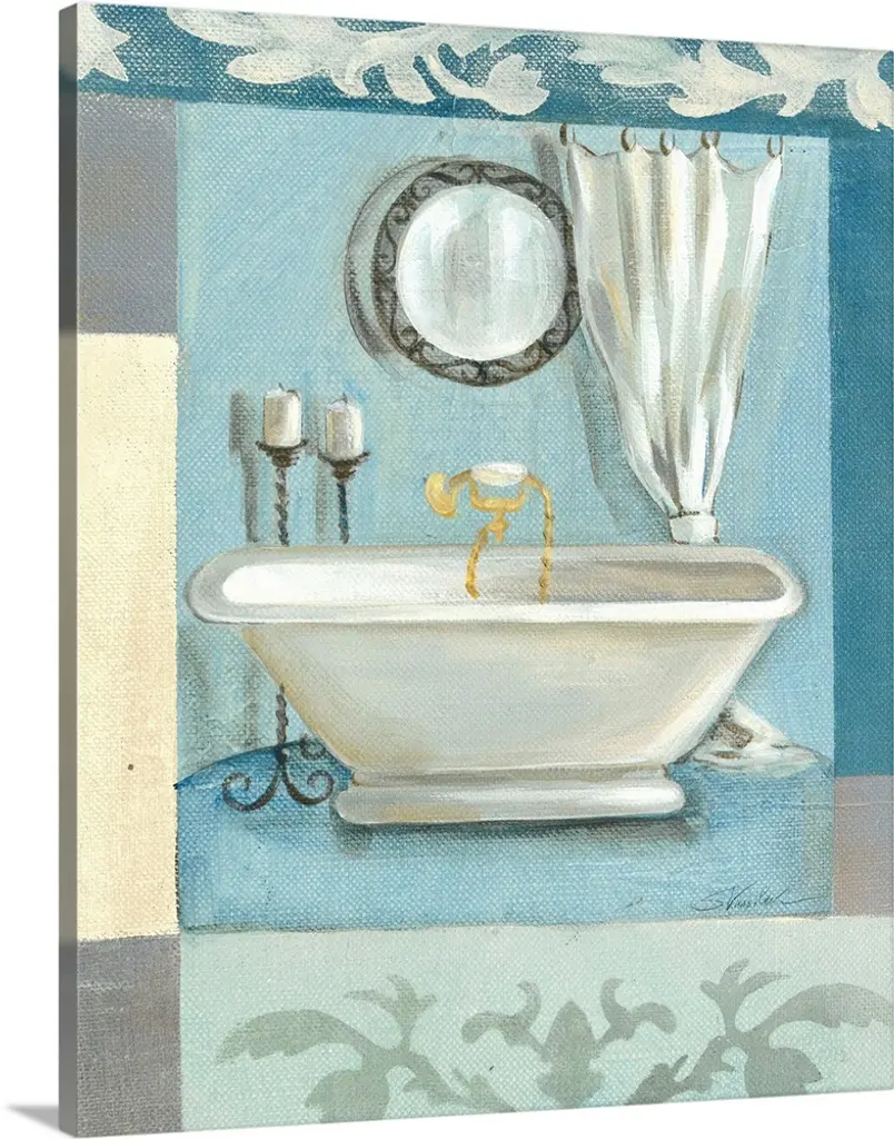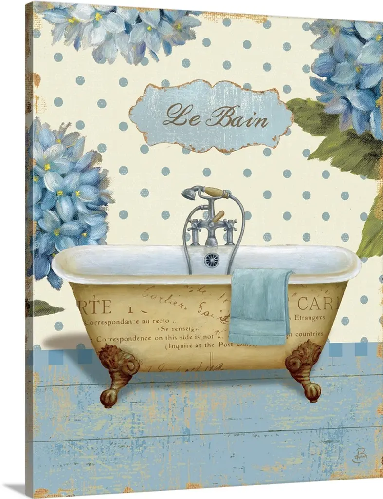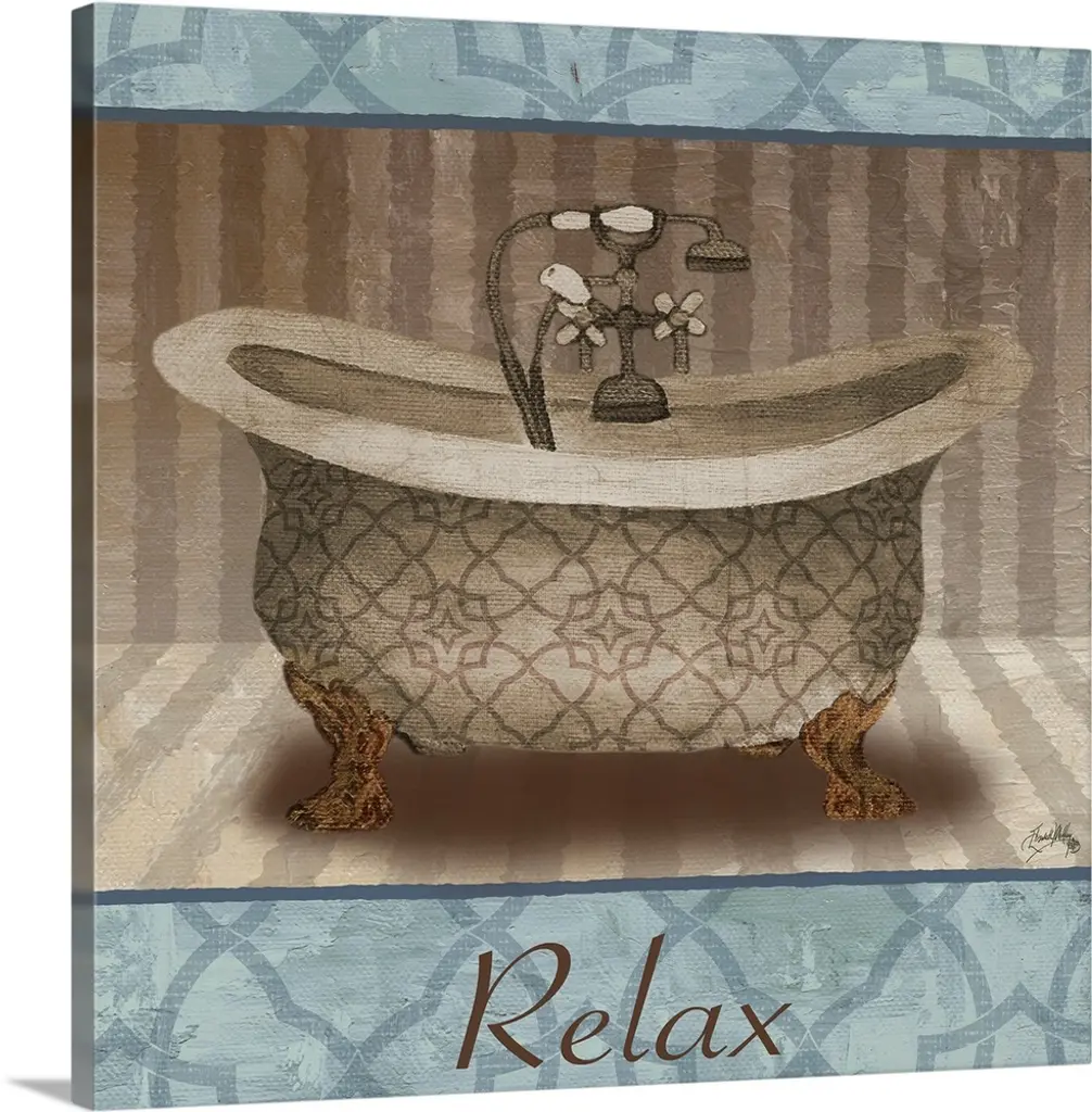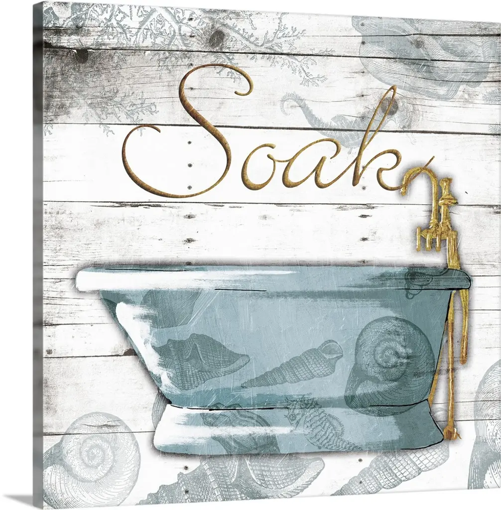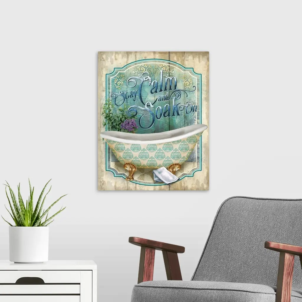 A painted tub overlaps a distressed sign with the words, "Stay Calm and Soak On" above it.