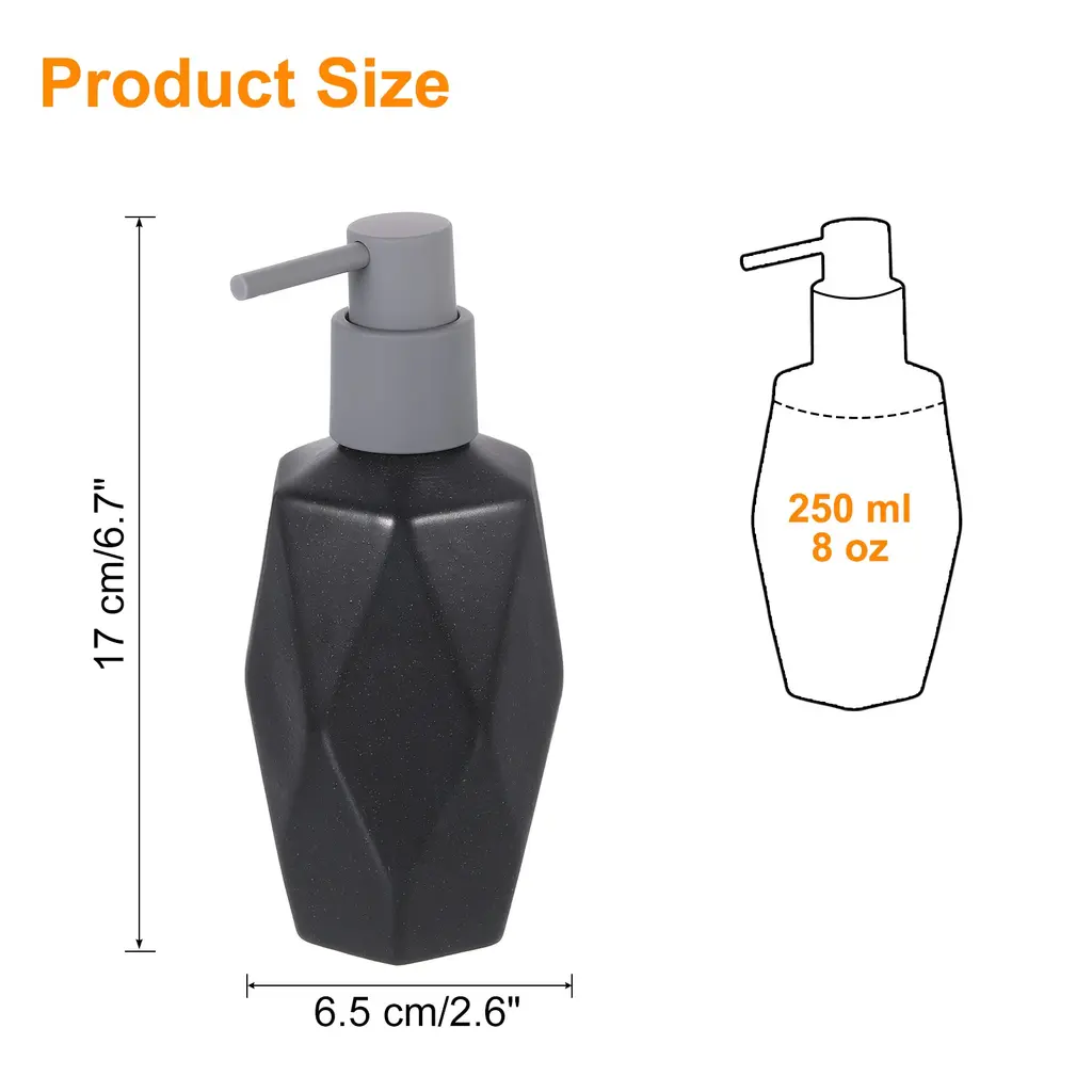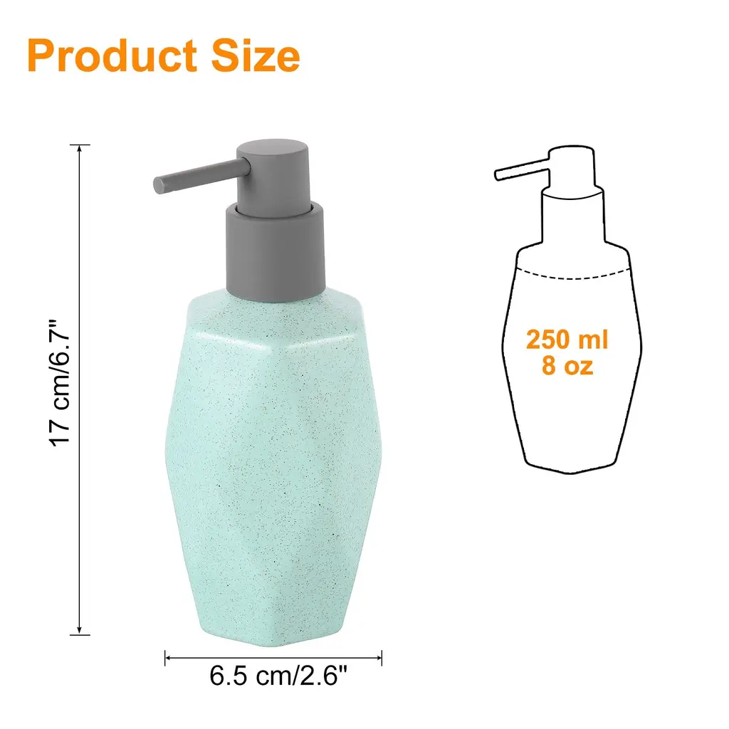 Description:Ceramic Quality and Big Capacity: The soap pump dispenser is made from quality ABS plastic and ceramic material, which is durable and resistant to wear and tear, and with a capacity of 250 ml/8 oz, which is suitable for holding a generous amount of liquid.Refillable and Non-Slip Design: The lotion dispenser has a big opening, easy to refill, reusable without the need for constant replacement of the container, and the bottom is unglazed and non-slip designed to improve slip resistance and also prevents wear and tear on the bathroom countertop.Pump Mechanism: Equipped with a pump mechanism, the dispenser provides a convenient and hygienic way to dispense soap or lotion with each press.Simple Operation: simply fill the dispenser with the desired liquid, press the pump to dispense the product, and wash hands or apply as needed.Versatile Application: The hand soap dispenser pump is great for placement in bathrooms, kitchens, laundry, hotels, and more places, for hand soap, dish soap, body wash, shampoo, conditioner, face cleaner, lotion, shaving cream, and so on.Specification:Material: ABS Plastic, CeramicColor: BeigeCapacity: 250 ml/8 ozDispenser Bottom Diameter: 6.5 cm/2.6 inchDispenser Height: 17 cm/6.7 inchPump Head Length: 5 cm/0.8 inchPackage Included: 1 pc x Soap Lotion Dispenser