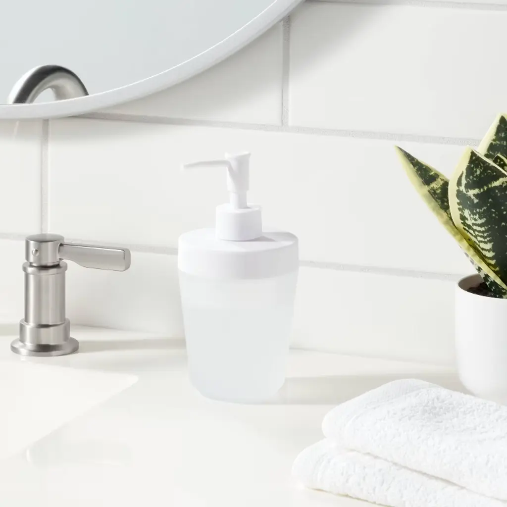 Whether setting up a new bath space or revamping an old one, you'll love adding elegant accents with the Soap Pump Frosted from Room Essentials™. This white soap pump features a simple design and a frosted finish for a delightful appeal that complements your decor. Made of plastic with an easy-to-press lid, this soap pump is compatible with gel and dish soap.Room Essentials™: Everyday Value