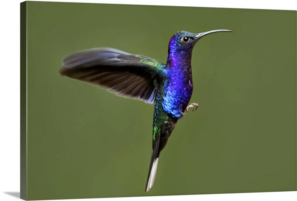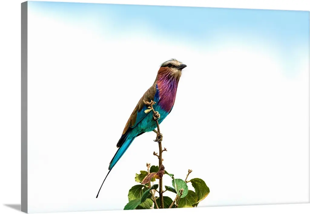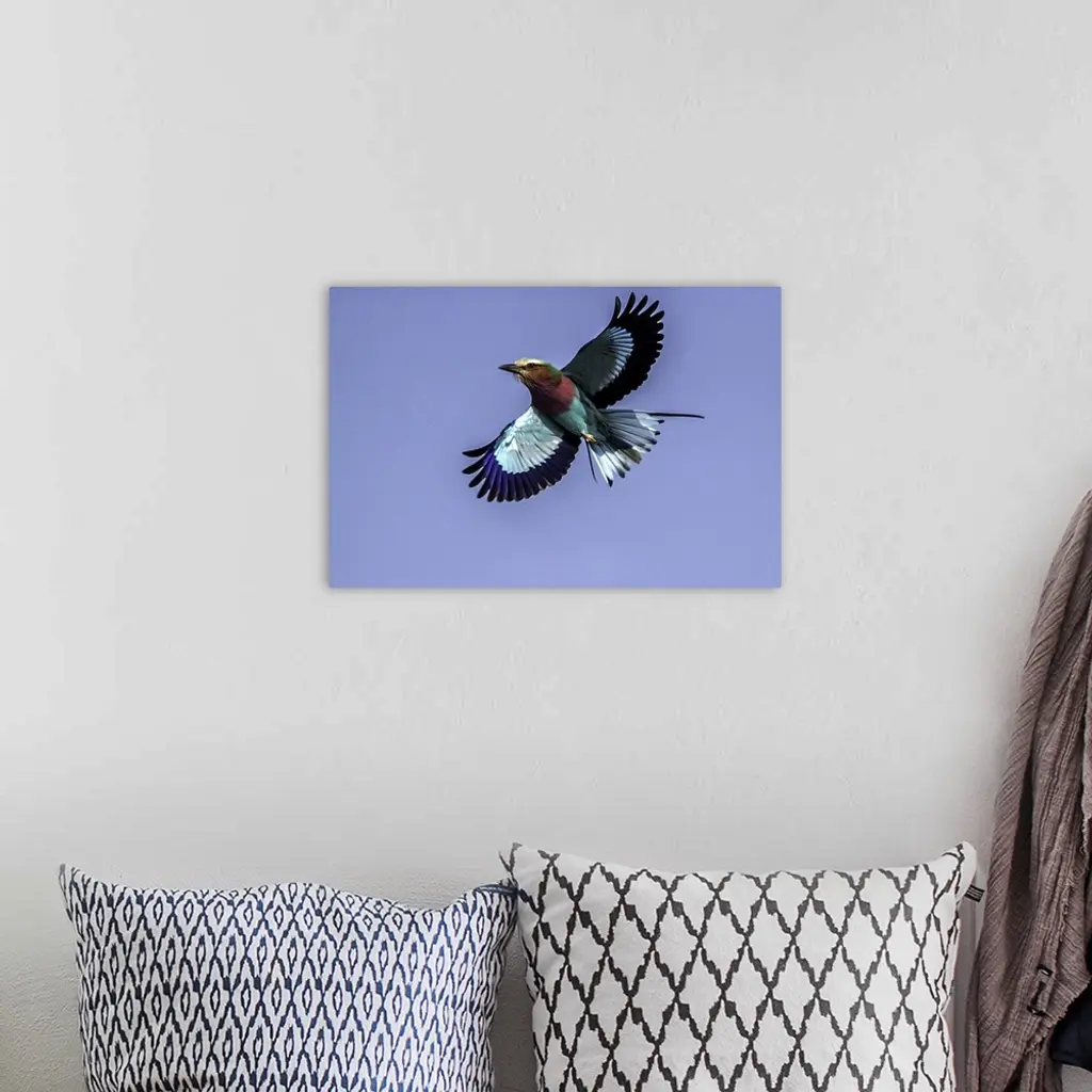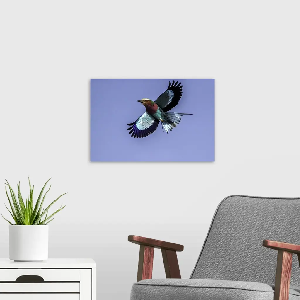 A Lilac-breasted Roller flying in the air with a blue sky above.