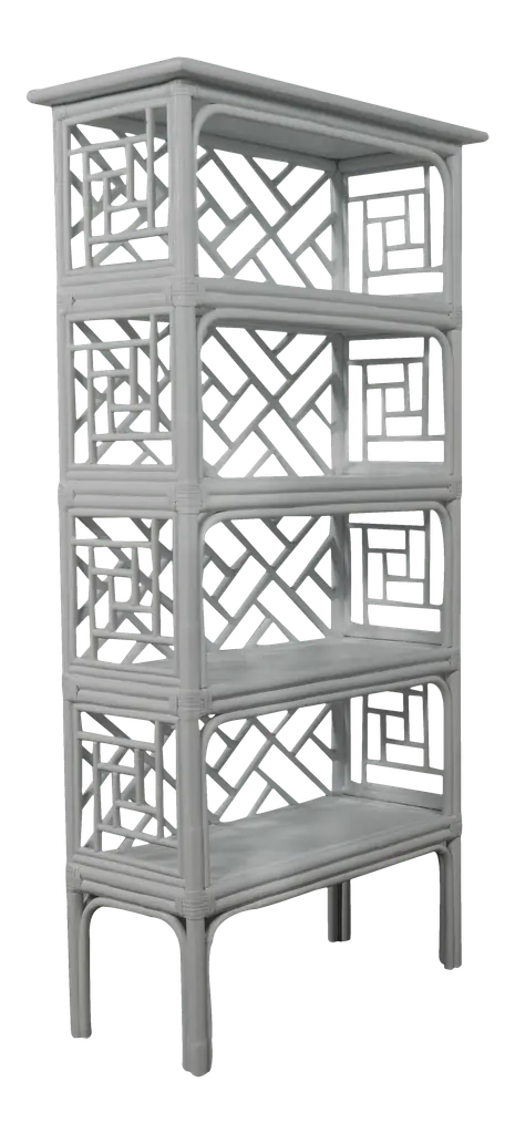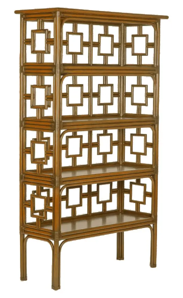 Showcasing stunning geometric fretwork and a versatile camel-brown finish, this chinoiserie-style bookcase is crafted of rattan with rawhide bindings for added strength and textural contrast. Its large proportions and four plywood shelves offer a wealth of space for books, accents, and more.