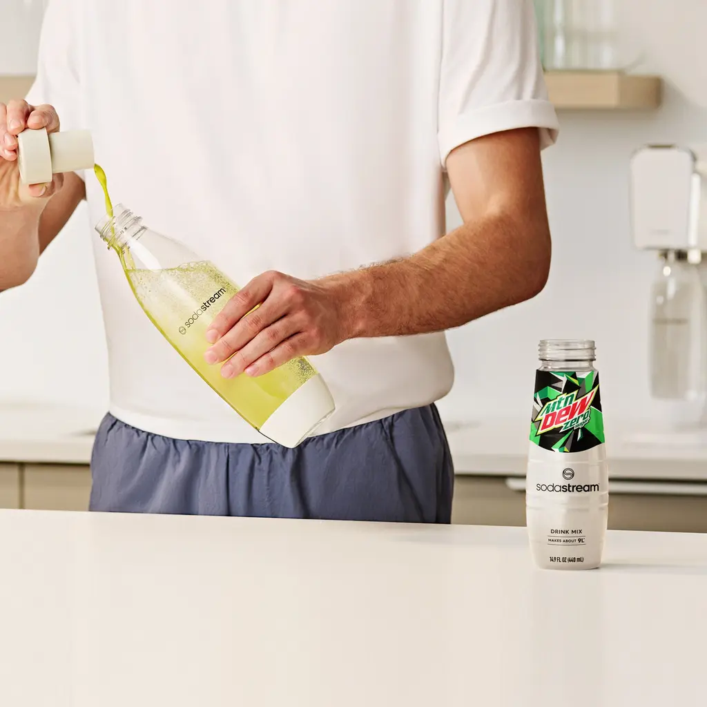 Made exclusively for SodaStream®, our MTN DEW® Zero Sugar drink mix makes it easy to enjoy your favorite flavors at home, but with none of the sugar. MTN DEW® exhilarates and quenches your thirst with its refreshing citrus kick. Turn sparkling water into a drink for every occasion — simply add MTN DEW® Zero Sugar drink mix to fresh sparkling water for an exhilarating, zero calorie flavor experience any time of day.