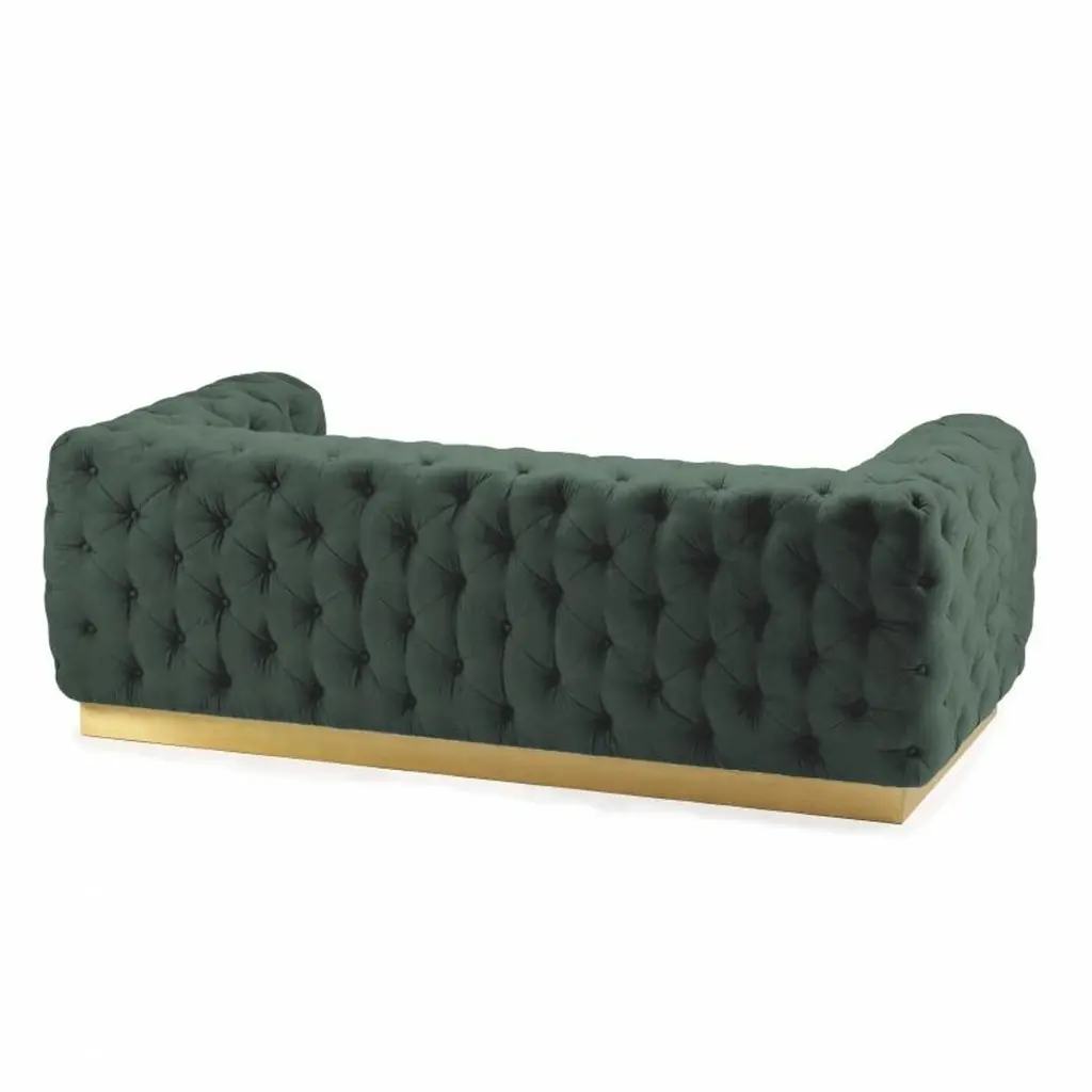 With perfect poise and structure, Victoria couch will welcome you and your guests into an incredibly comfortable and elegant seating experience.Victoria couch is upholstered in emerald green velvet and finished with a polished copper footer. Made to Order.