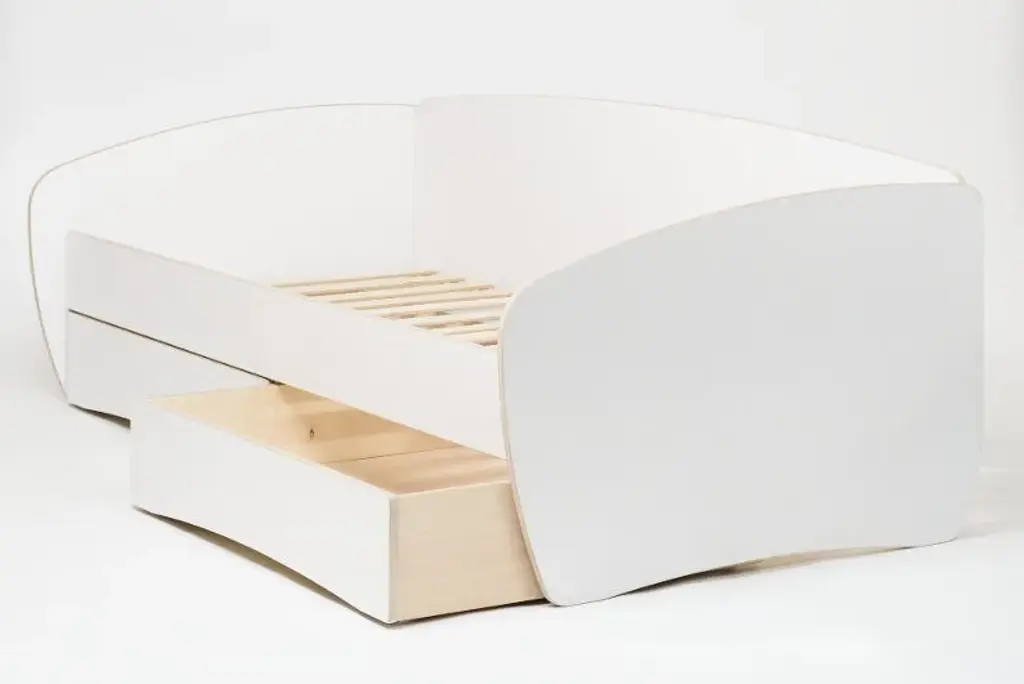 A dog is man’s best friend? No, sleep is! Bed Soffi, with its undulating lines, is made for first-class sleep. Don’t worry. It’s wide enough to accommodate your dog. Or a companion yearning for relaxing sleep.Under the bed on strong wheels two bed boxes with a depth of 60 cm. Made of 18 mm white laminated birch plywood, mattress size 90×200 cm. Includes the slatted bed frame made of plywood. The height of the front edge of the Soffi bed is 40 cm, the height of the bed base is 31 cm, the height of the back wall is 70 cm. A suitable mattress is 15-20 cm high.