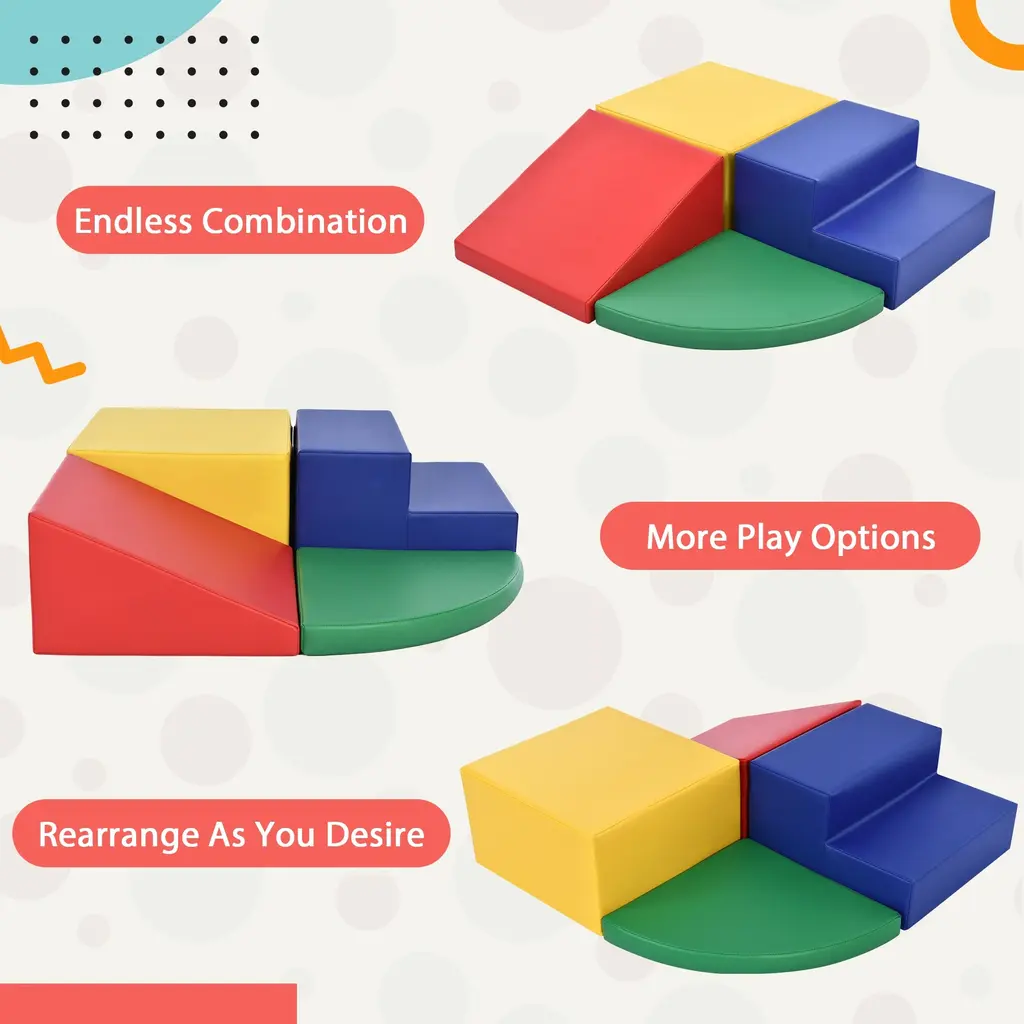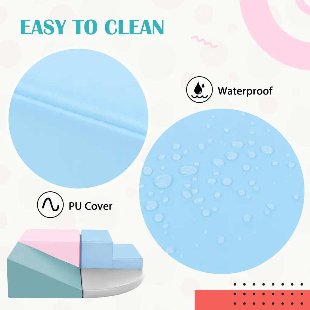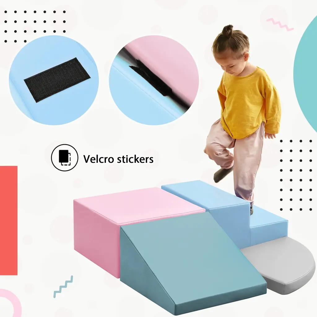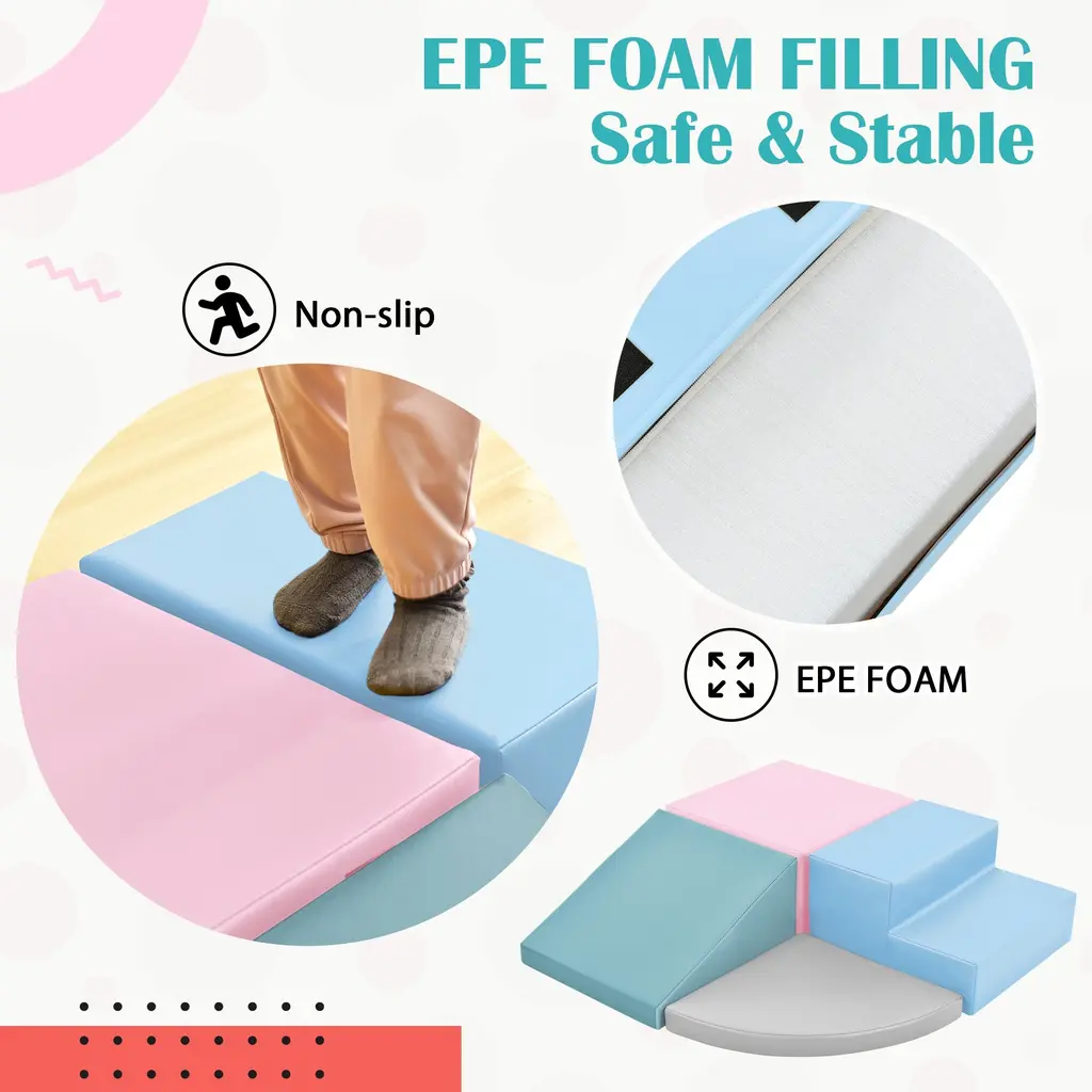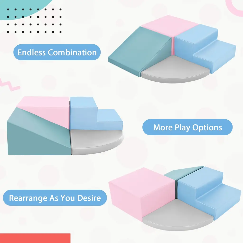 Safe and Soft - This playset for children is made from high-quality EPE foam lining and features a skin-friendly surface, ensuring a safe and gentle play environment for kids.Versatile Play - Designed specifically for toddlers, this climbing toy set offers various activities such as climbing, crawling, lifting, stacking, and sliding, encouraging children to engage in physical play and explore their energetic nature.Flexible Configuration - The playset includes a stair, block, ramp, and quarter pad, allowing children to arrange and combine them in different ways according to their preferences. Additionally, multiple sets of soft foam toys can be integrated for children to create their own imaginative play spaces.Enhanced Safety - Each component of the playset is equipped with Velcro fastening strips to securely stack the pieces together, reducing the risk of accidental slipping or bumping. This ensures a safe play experience for children as they freely enjoy their playtime.Easy Maintenance - The high-quality material used in this playset is easily cleaned by wiping with a damp cloth, ensuring that the play area remains clean and hygienic at all times. Please refer to the product size picture for the overall dimensions. There are 2 color combinations available for selection.
