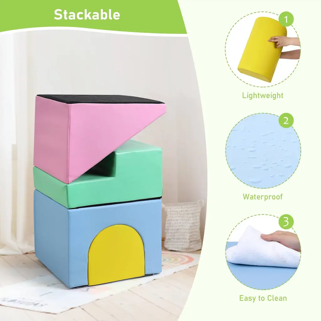 Ensure the safety and fun of your little ones with our Soft Toddler Climbing Set. This set is composed of PU leather with anti-slip particles on the bottom and foam with a certain level of support, making it both soft and firm. It complies with CPSIA certification standards for children, giving you peace of mind.【4PCS Set】Our foam climbing set includes 4 parts in 1 package: Triangle, Rectangle, Half Moon, and Staircase. These pieces can be used independently or combined in various ways to create a customized climbing experience. When assembled, the climber measures 71" L x 20" W x 15" H.【Playground Fun】Toddlers can climb, crawl, and slide on this kit, helping them learn simple motor skills, exercise body balance, and promote physical development. This climbing set is recommended for toddlers aged 9 months and up.【Easy to Clean】The surface of this indoor climbing play kit is waterproof and can be easily wiped clean with a soft damp cloth before your child plays on it. This ensures a hygienic playtime environment for your little ones.【Convenient Packaging】The 4 pieces of the climbing set will be packed in 1 box, making it easy to transport and store. If you have any questions or concerns, our dedicated after-sales staff is here to assist you. We are always by your side.Create a safe and enjoyable playtime experience for your toddlers with our Soft Toddler Climbing Set. Order now and watch as they develop important skills while having fun!
