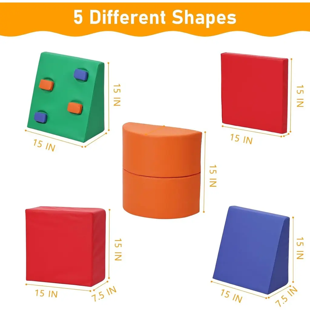 EXPLORE AND PLAY: Our soft climbing set for toddlers provides limitless opportunities for exploration and imaginative play. Made from high-quality PU leather and featuring anti-slip particles on the bottom, this set ensures a secure and safe experience. The foam material strikes the perfect balance of softness and firmness, guaranteeing a comfortable playtime. This climbing set meets CPSIA certification standards, prioritizing your child's safety.VERSATILE 5-PIECE SET: This foam climbing kit includes five components: a Triangle, Climbing Triangle, Large Cuboid, Small Cuboid, and Half Moon. All pieces are neatly packaged together, allowing for independent use or creative combinations to craft a unique climbing experience. When fully assembled, the climber measures 71" L x 20" W x 15" H, offering ample space for active play.SUPPORT PHYSICAL DEVELOPMENT: Encourage your toddler’s imagination as they climb, crawl, and slide on this engaging set. It aids in developing basic motor skills, improves body balance, and promotes overall physical growth. Recommended for children aged 9 months and older, this climbing kit creates a stimulating environment for both play and development.EASY TO CLEAN AND MAINTAIN: The waterproof surface of this indoor climbing playset makes cleaning a breeze. Simply wipe it down with a soft, damp cloth before each play session to ensure hygiene and cleanliness. This feature provides peace of mind knowing that your child is playing in a safe, clean environment.CUSTOMER SATISFACTION ASSURED: The climbing set's four pieces are efficiently packed in one box for easy handling. If you have any questions or require assistance, our dedicated customer service team is always ready to help. We take pride in offering exceptional support and ensuring your complete satisfaction.