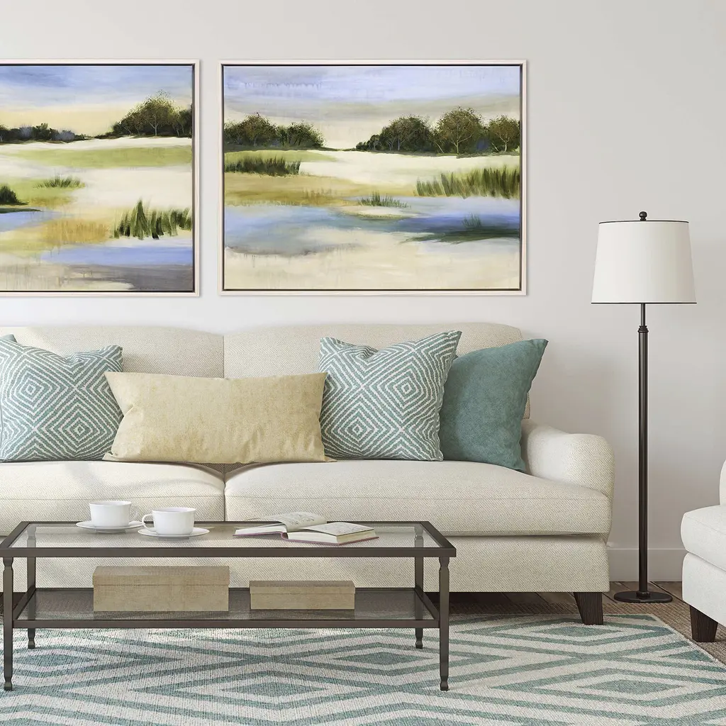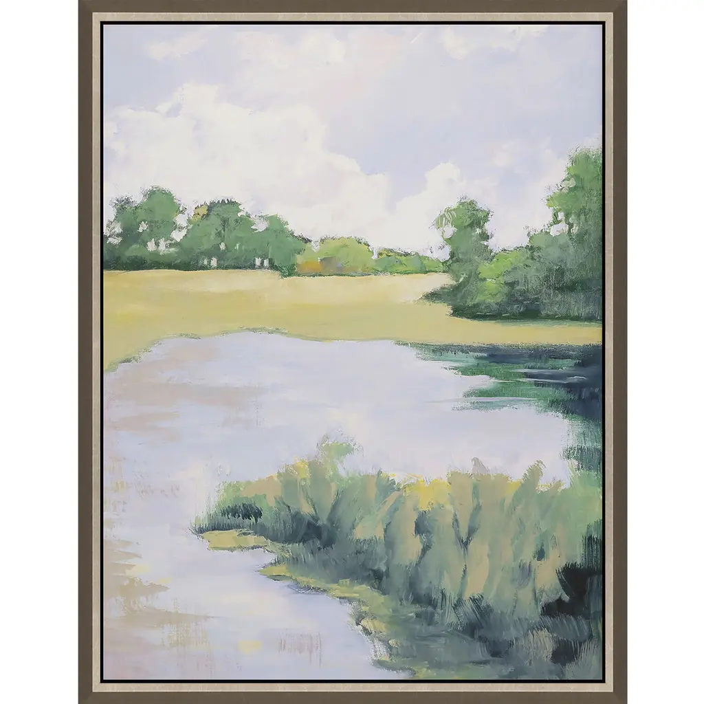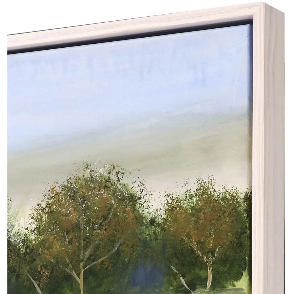 Exclusive hand painted canvas. Hand stretched and mounted in a whitewash wood floater frame.