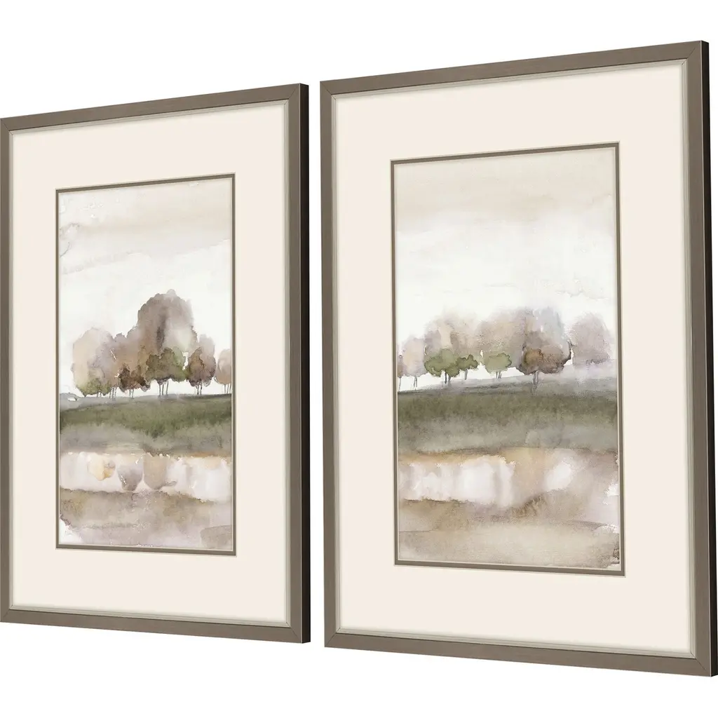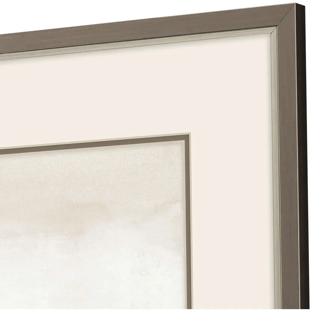 Shades of green emerge across an awakening landscape. Matted in white and framed in a brushed pewter finish moulding with silver lip.