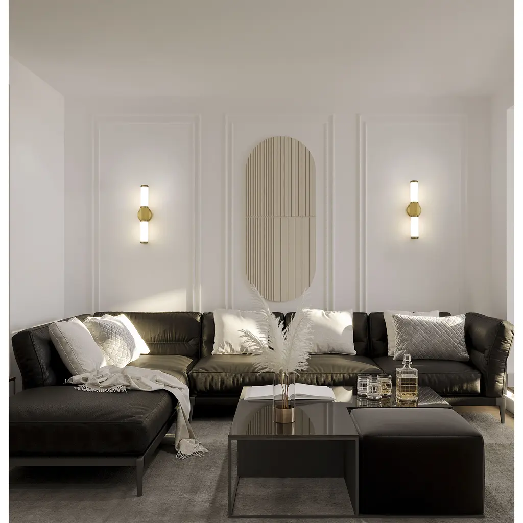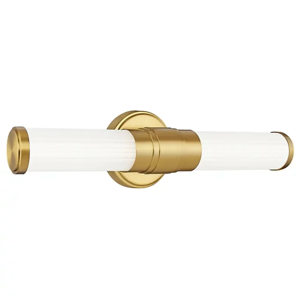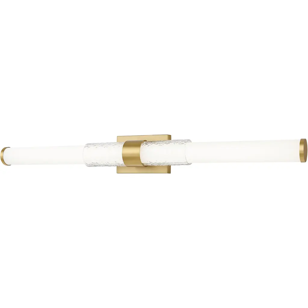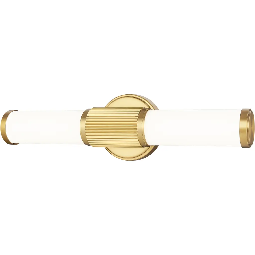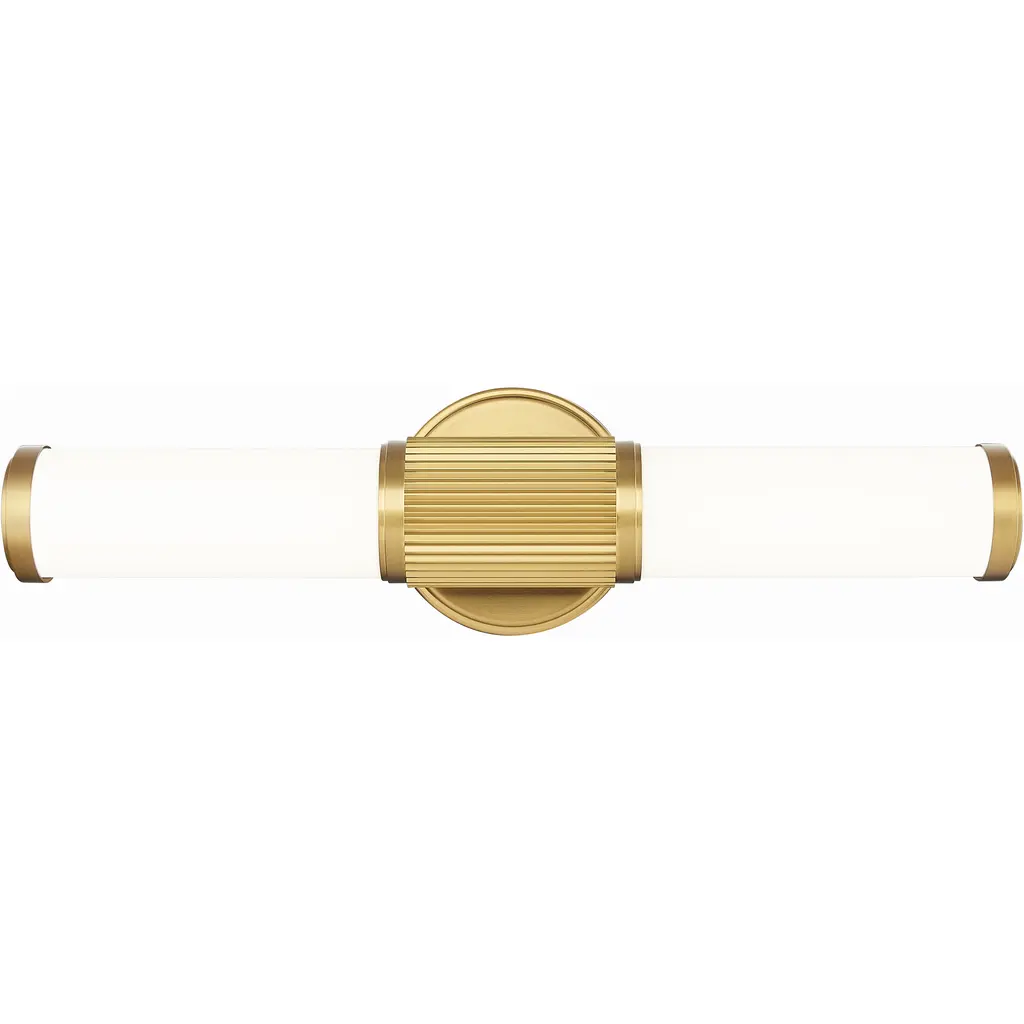 Infused with visual interest and dimensionality, this modern LED vanity bath light is a perfect upgrade for your home. It boasts a rich modern gold finish, instilling warmth and sophistication to a fluted cuff and beveled wall plate. Opal glass is a cool, refined choice, ensuring inviting illumination.