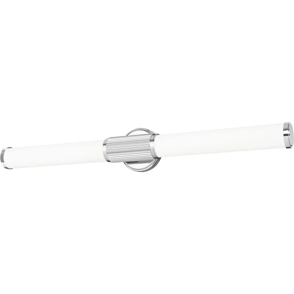 Robust lighting and beautiful details pair to perfection in this modern LED vanity bath light. Its generous size is created with a pair of opal glass cylinder shades, casting soft, inviting illumination. A chrome finish shines in the light and adds dimension to a fluted cuff and smooth beveled wall plate.