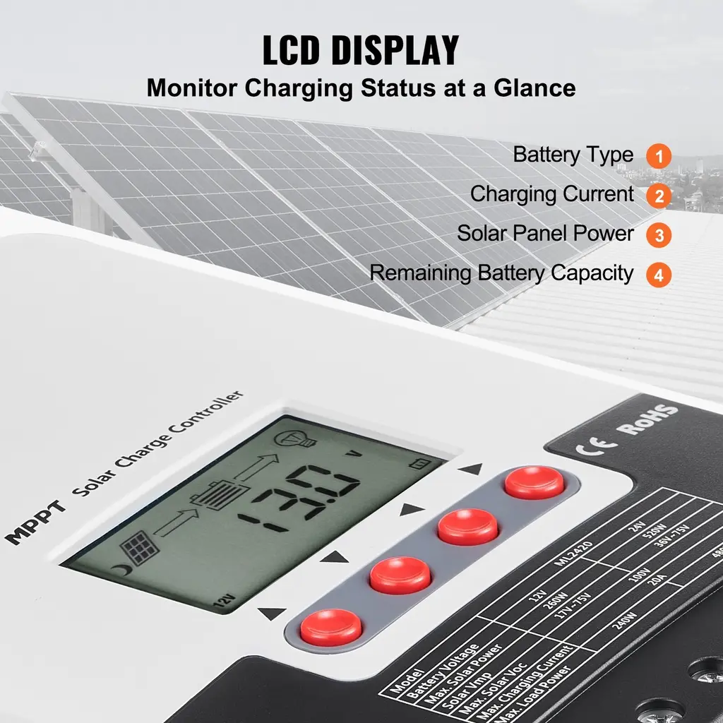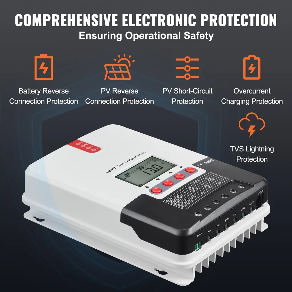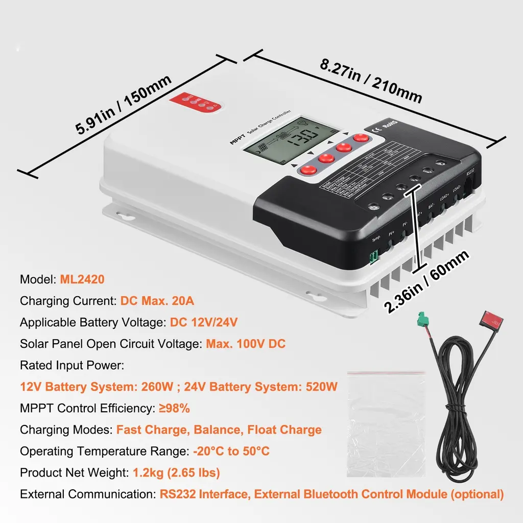 Efficient Charging: Utilizing advanced MPPT technology, surpassing traditional PWM charging technology by 15-30%, and achieving an ideal conversion efficiency of up to 98%. This means faster charging times, higher energy utilization, and longer-lasting operation for your devices. Versatile Compatibility: Suitable for various environments and devices, from home solar power systems to mobile photovoltaic systems. The solar charge controller can handle charging currents of up to 50A and supports a maximum solar panel power of 12V 660W / 24V 1320W/ 12V 400W / 24V 800W/260W/520W. It's compatible with various common deep-cycle sealed batteries (AGM), gel batteries, flood batteries, and lithium batteries. Easy to Use & Control: Equipped with a built-in Bluetooth module, allowing remote monitoring of important data for user convenience. The mppt solar controller helps users easily monitor and adjust the device's operating status. Additionally, it comes with a TTL communication interface, supporting the Modbus communication protocol for versatile functionality expansion and meeting various communication needs. High Stability: Automatic adjustment algorithms and support for current-limiting charging mode ensure stable operation even in extreme conditions, such as high temperatures up to 50°C (122°F) or low temperatures down to -20°C (-4°F), as well as during high charging power situations. Enhanced Security: Offers all-around electronic protection features, including battery reverse protection, PV reverse protection, PV short-circuit protection, overcurrent protection during charging, and TVS lightning protection. These features ensure the security and long-term use of the device. Package Content 1 x Solar Charge Controller 1 x Packaging Bag 1 x User Manual