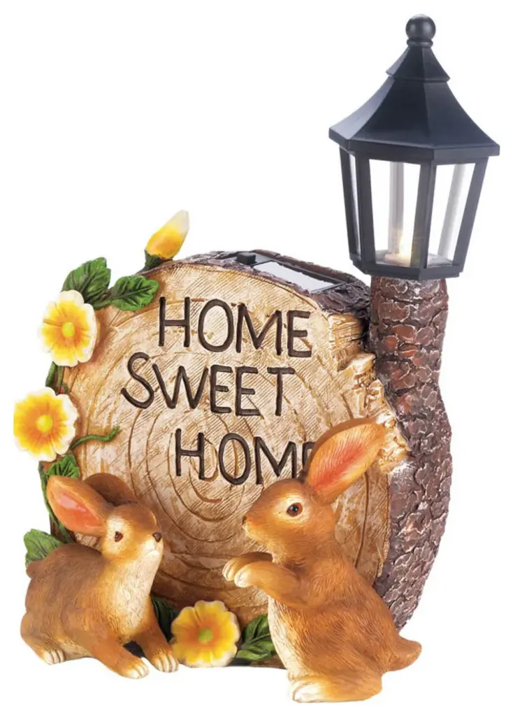 Solar Home Sweet Home Bunnies.The solar light weighs 1.4 lbs. and measures 7x4.25x9.75 inches.Made of durable polyresin, solar panel to create beautifully detailed décor.A sweet addition to your front or backyard garden, this garden décor will make your outdoor space feel instantly more inviting. Place near a pond, fountain, flower or vegetable garden and the solar light will provide a soft glow at night.To clean your garden ornament, dust lightly or wipe with a damp cloth as needed.Two bunnies are ready to make your yard ''home sweet home'' and they''re bringing plenty of charming style with them. This solar-powered garden decoration features a classic lantern that lights up at night after soaking up the sun all day.