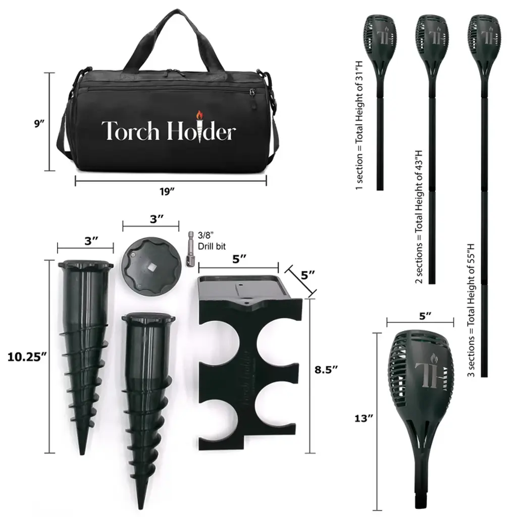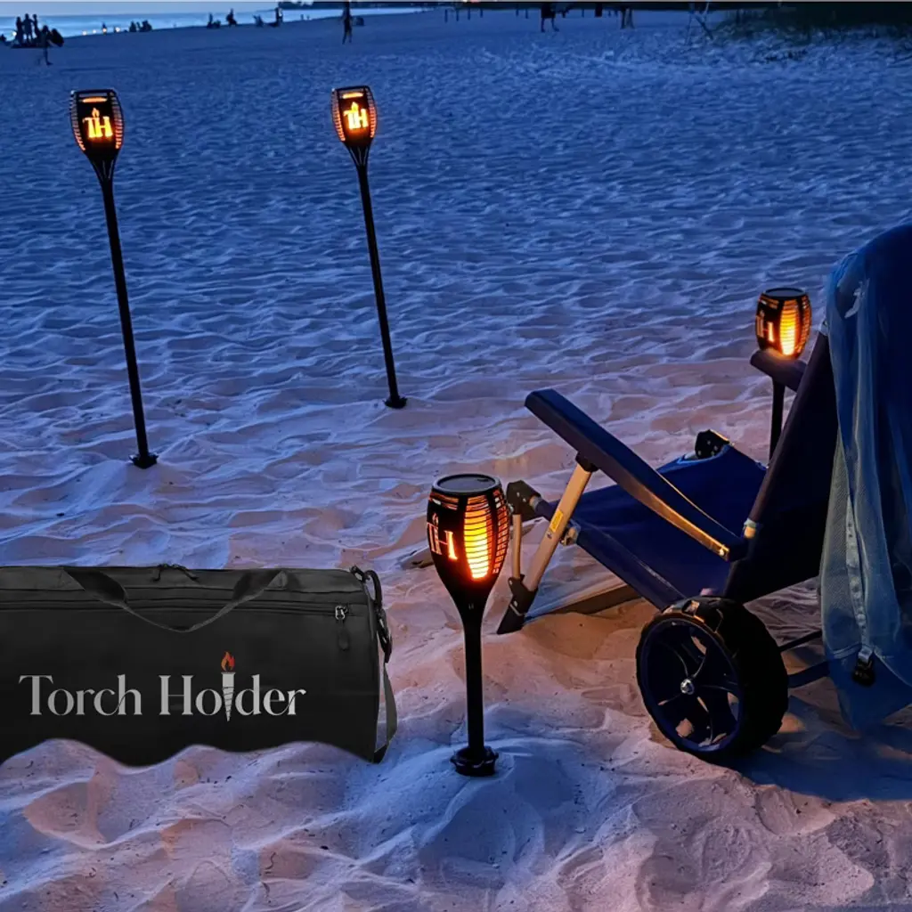 🔥 Light It Up. Pack It Down. Store It Right. Whether you're headed to the beach, lighting up the backyard, or organizing your shed, this all-in-one Ultimate Solar Torch Kit is built to perform. It includes everything you need for secure, flickering flame light—plus a smart storage system that keeps your gear clean and ready between uses. What’s in the Kit 2 Solar-Powered Flickering Flame Torches 2 Complete Pole Sets, each includes: 3 Equal-Length Sections 2 Connectors 1 Ground Stake 2 Heavy-Duty Ground Spikes (11” L, Rust-Proof Polycarbonate) 1 Drill Chuck Adapter with 3/8” Drill Bit 1 Wall Holder (Stores 2 Torches + 2 Spikes) 1 Water-Resistant Multi-Pocket Duffle Bag (19” L x 9” H) Perfect For Beach nights & bonfires Backyard patios & garden paths RVs, campsites, and trailers Outdoor parties & special events Seasonal storage in garages, sheds, or campers How to Use Saturate compacted soil if needed Use included drill chuck to drive spikes into the ground Assemble torch poles to your preferred height Insert torch into spike—it lights up automatically at dusk Store in duffle or wall holder when not in use