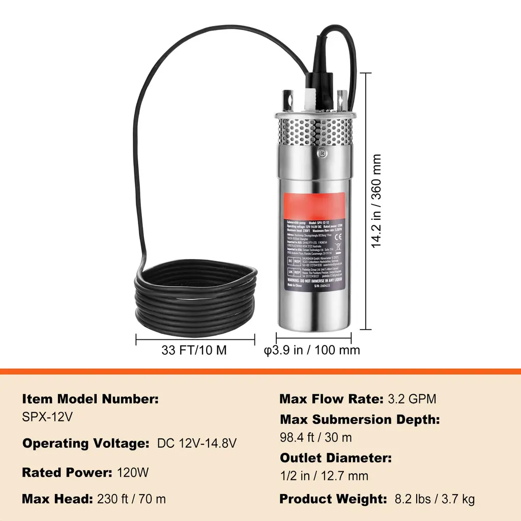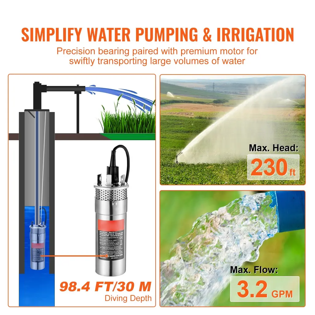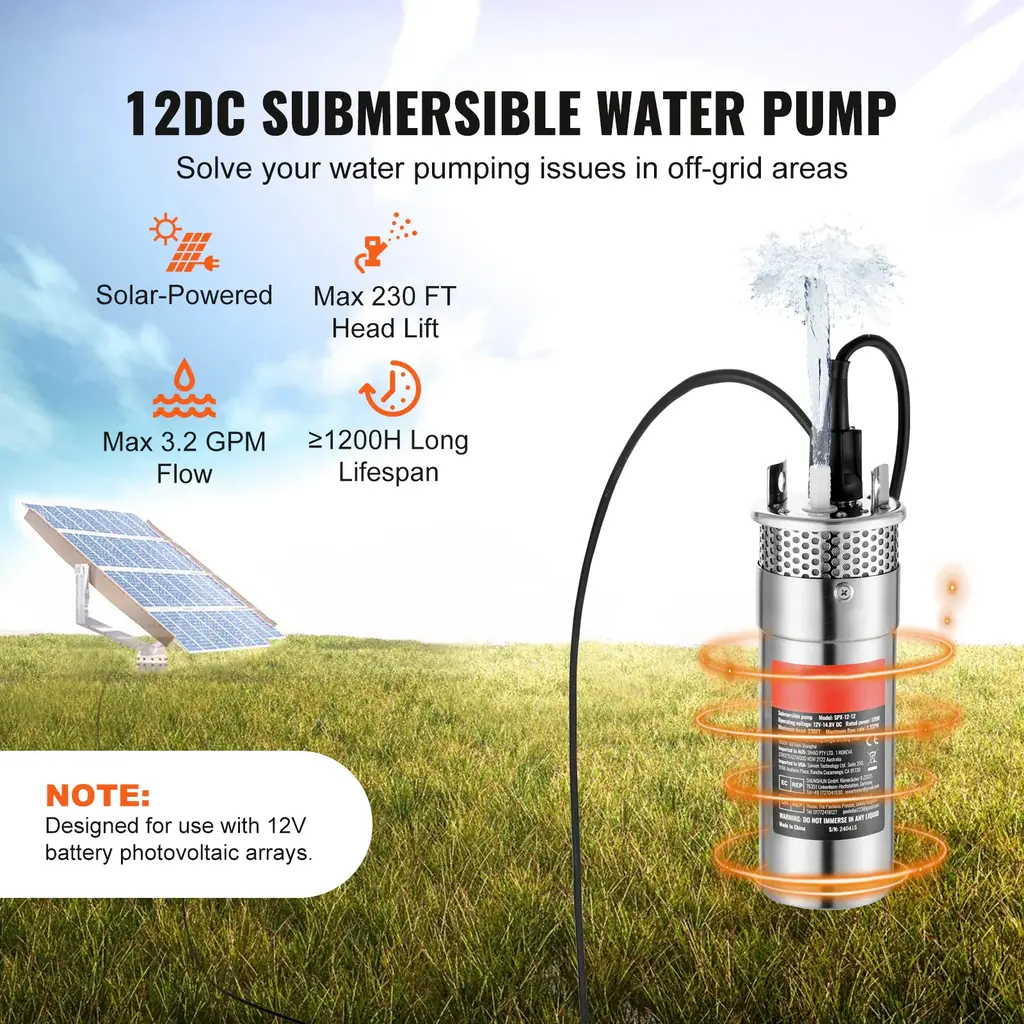 Solar Powered: Say goodbye to grid distance and power supply limitations! Simply connect our solar water pump to a 12V battery photovoltaic pack to use. With a wide voltage range of DC 12V-14.8V/48V-82V/24V-42, you pick the solar panels and power system that suit you better. Regular maintenance: If the pump is not running, move the protective steel mesh at the bottom and clean the internal silt and debris. Large Flow and High Head: With a head that reaches up to 230/273/272/230 ft and a flow rate of 1.6 GPM, this solar well pump is your go-to for medium-distance water transfer. Plus, it can dive up to 98.4/65.6 ft deep, making it a champ even in deep wells, providing an efficient and stable water supply. IP68 Waterproof Rating: Featuring an excellent sealed pump body structure, our solar water well pump handles underwater work, so you can leave it submerged year-round. Its double-layer stainless steel filter mesh effectively filters impurities and particles, reducing the risk of pump clogging and extending its lifespan to over 1200/800 hours. High-Speed Motor: Equipped with a high-speed carbon brush DC motor, the solar submersible water pump features high efficiency, no excitation loss, and good speed regulation performance. With a speed of over 2600/2900 RPM, it's all about efficiency and speed for drawing and delivering water. Off-Grid Oasis: Perfect for wells over 4 inches in diameter, our solar pump comes with a generous 10 ft power cord, giving you plenty of reach without the hassle. We only provide the solar well pump, so you need to prepare solar panels, controllers, storage batteries, and pipes to build a complete solar water transfer system. Package Content 1 x Solar Well Pump 1 x User Manual