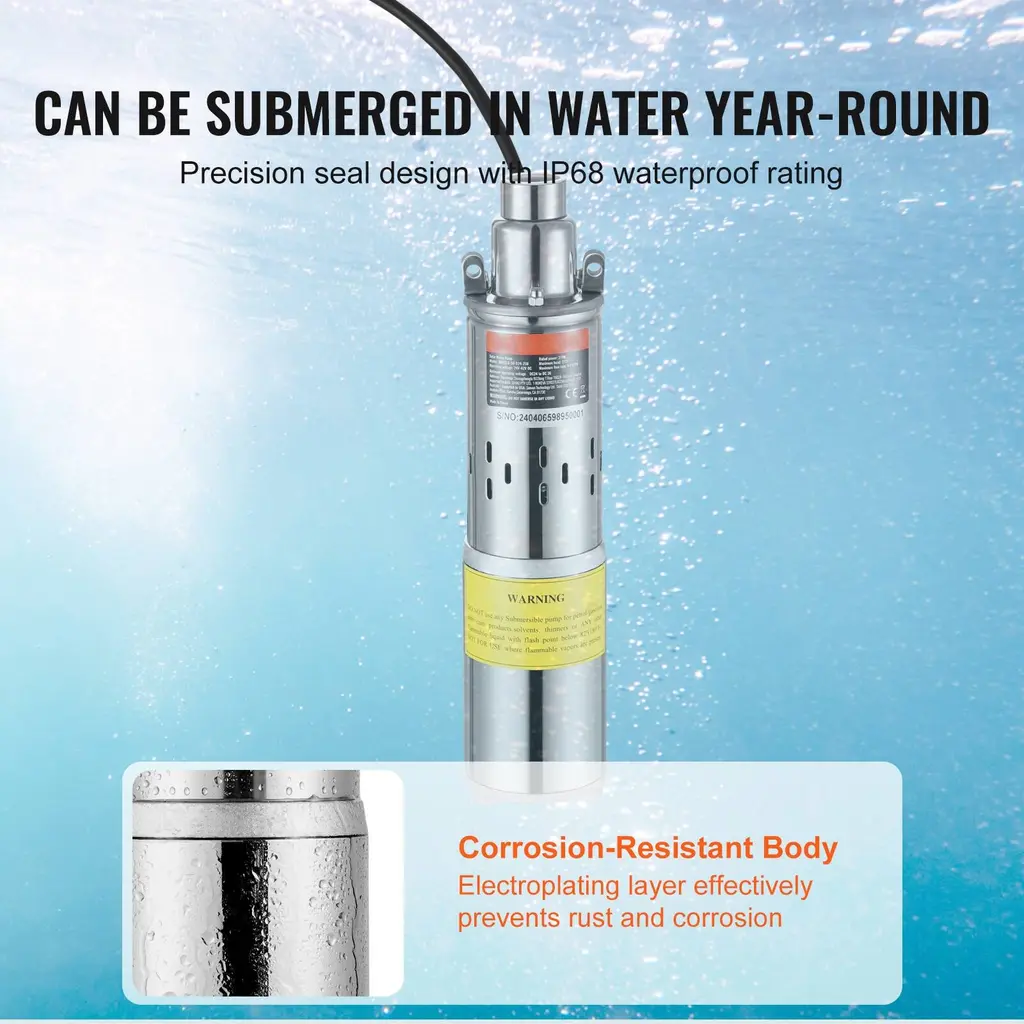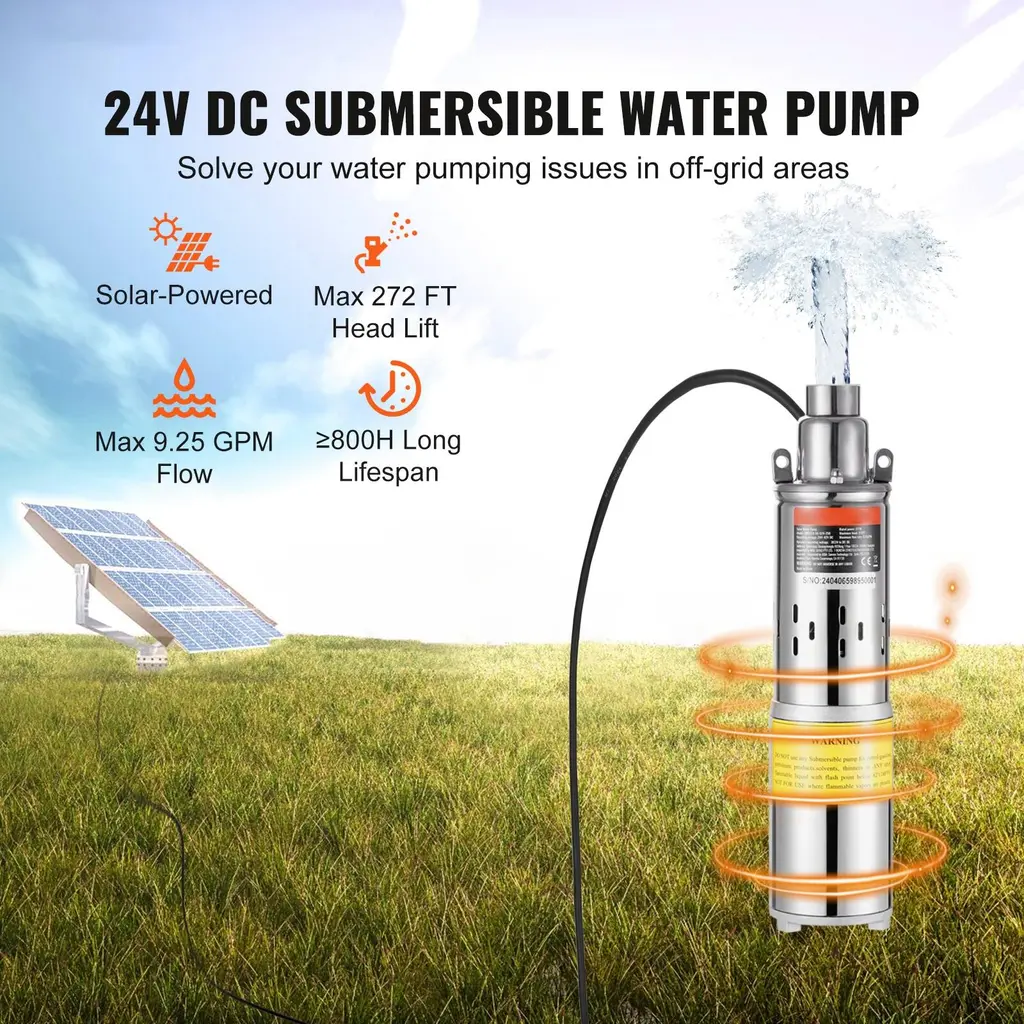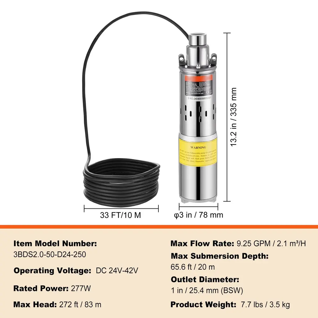Solar Powered: Say goodbye to grid distance and power supply limitations! Simply connect our solar water pump to a 12V battery photovoltaic pack to use. With a wide voltage range of DC 12V-14.8V/48V-82V/24V-42, you pick the solar panels and power system that suit you better. Regular maintenance: If the pump is not running, move the protective steel mesh at the bottom and clean the internal silt and debris. Large Flow and High Head: With a head that reaches up to 230/273/272/230 ft and a flow rate of 1.6 GPM, this solar well pump is your go-to for medium-distance water transfer. Plus, it can dive up to 98.4/65.6 ft deep, making it a champ even in deep wells, providing an efficient and stable water supply. IP68 Waterproof Rating: Featuring an excellent sealed pump body structure, our solar water well pump handles underwater work, so you can leave it submerged year-round. Its double-layer stainless steel filter mesh effectively filters impurities and particles, reducing the risk of pump clogging and extending its lifespan to over 1200/800 hours. High-Speed Motor: Equipped with a high-speed carbon brush DC motor, the solar submersible water pump features high efficiency, no excitation loss, and good speed regulation performance. With a speed of over 2600/2900 RPM, it's all about efficiency and speed for drawing and delivering water. Off-Grid Oasis: Perfect for wells over 4 inches in diameter, our solar pump comes with a generous 10 ft power cord, giving you plenty of reach without the hassle. We only provide the solar well pump, so you need to prepare solar panels, controllers, storage batteries, and pipes to build a complete solar water transfer system. Package Content 1 x Solar Well Pump 1 x User Manual