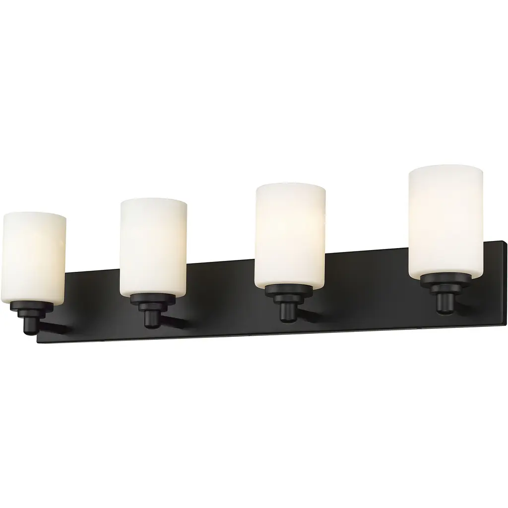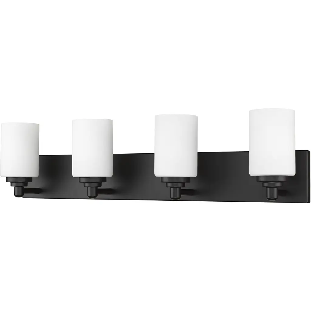 Let your bathroom or hallway bask in soft, warm light. This contemporary four-light wall sconce has a sophisticated, streamlined look, and extends from a long mirrored plate for a chic contrast. From the sconce's cylindrical white etched glass shades to its matte black finish, this fixture stylishly upgrades your space.