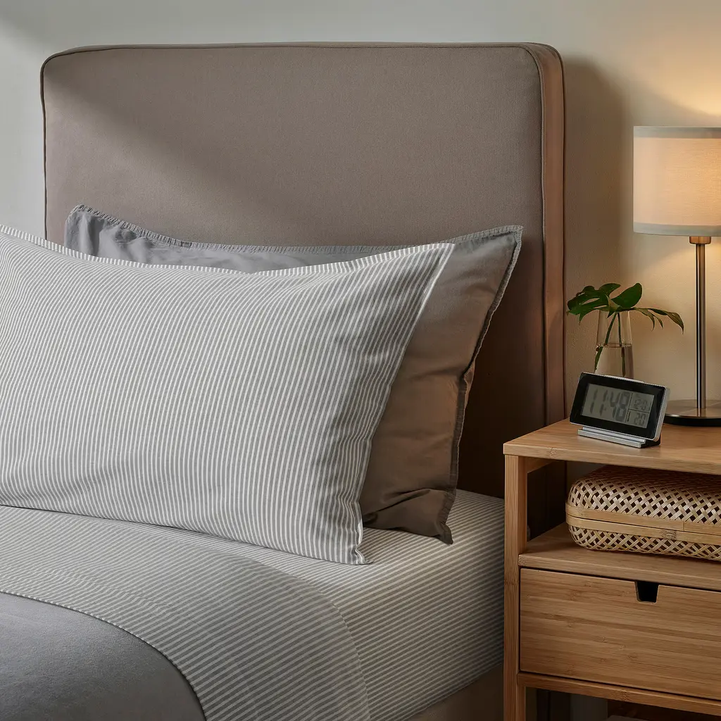 SOLFIBBLA Sheet set - gray white/stripe Twin. Made of 100% cotton - a natural and durable material that becomes softer with every wash. The top edge of the sheet is sewn in a double layer and creates a decorative finish that you can fold down over the comforter.